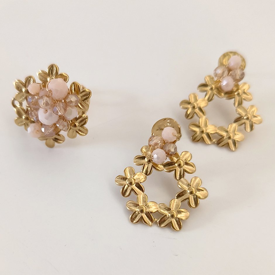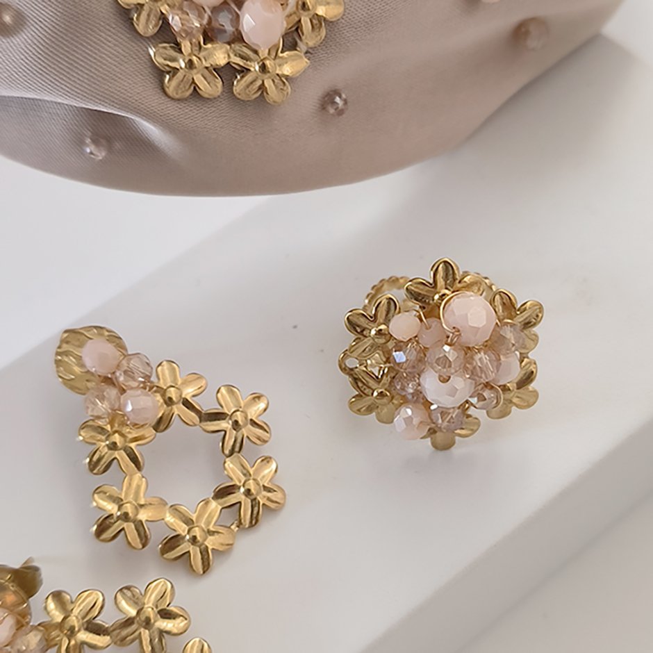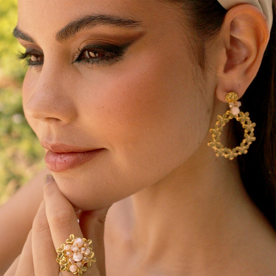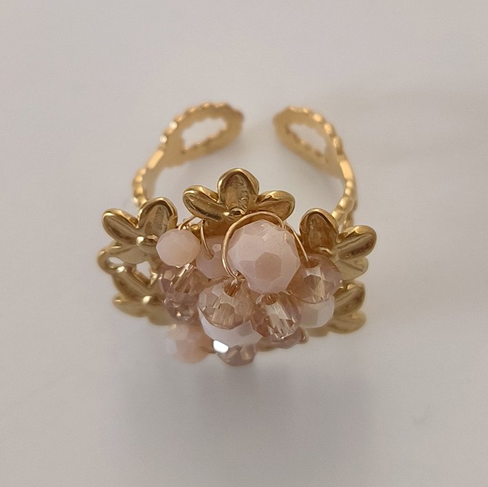 Anel da linha casual/cerimónia, em tons dourado e beje. Com base ajustável, no topo com peça irregular também em aço, definida por motivos florais e ao centro bordada com cristais swarovsky facetados.