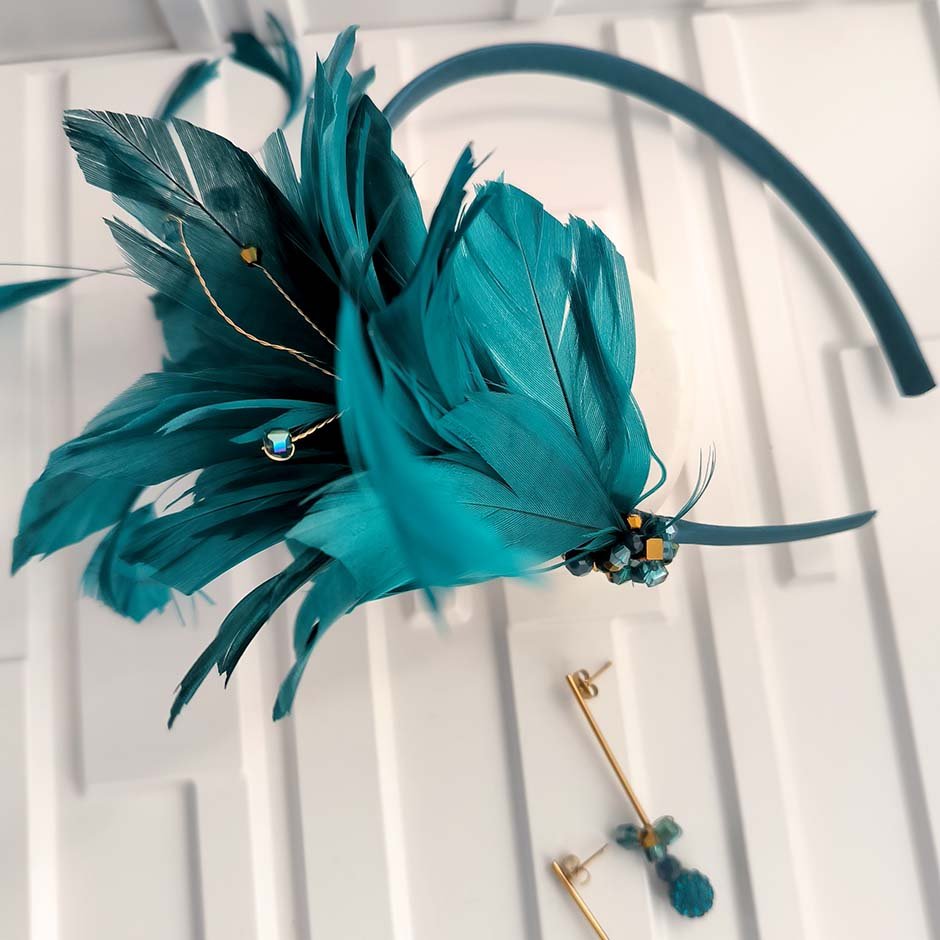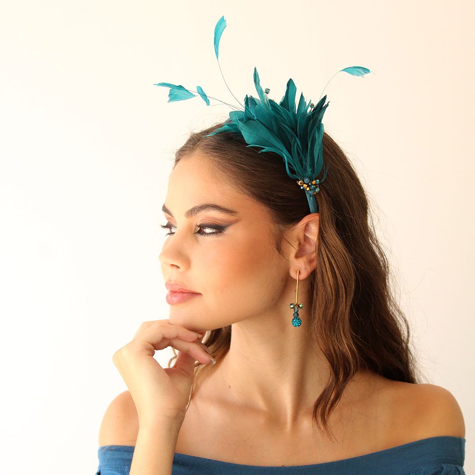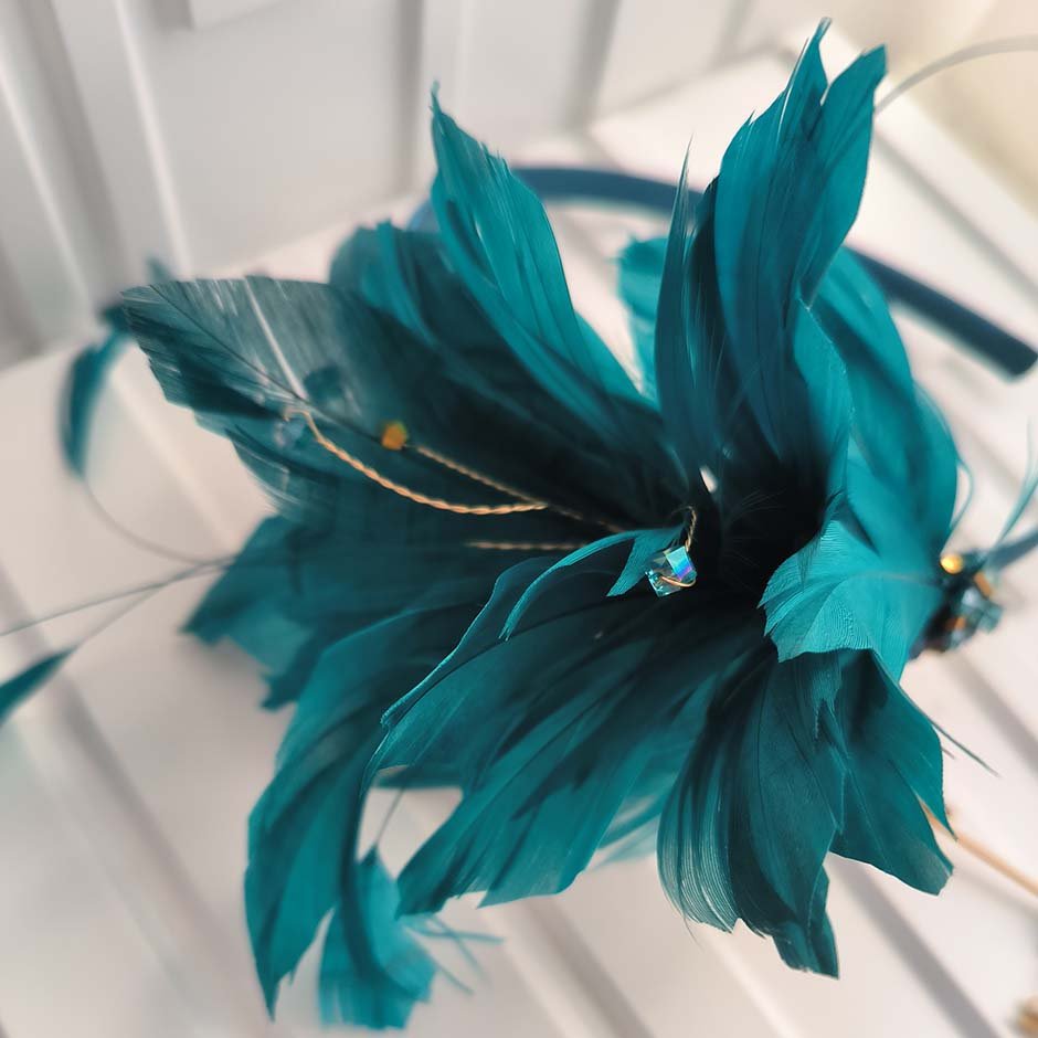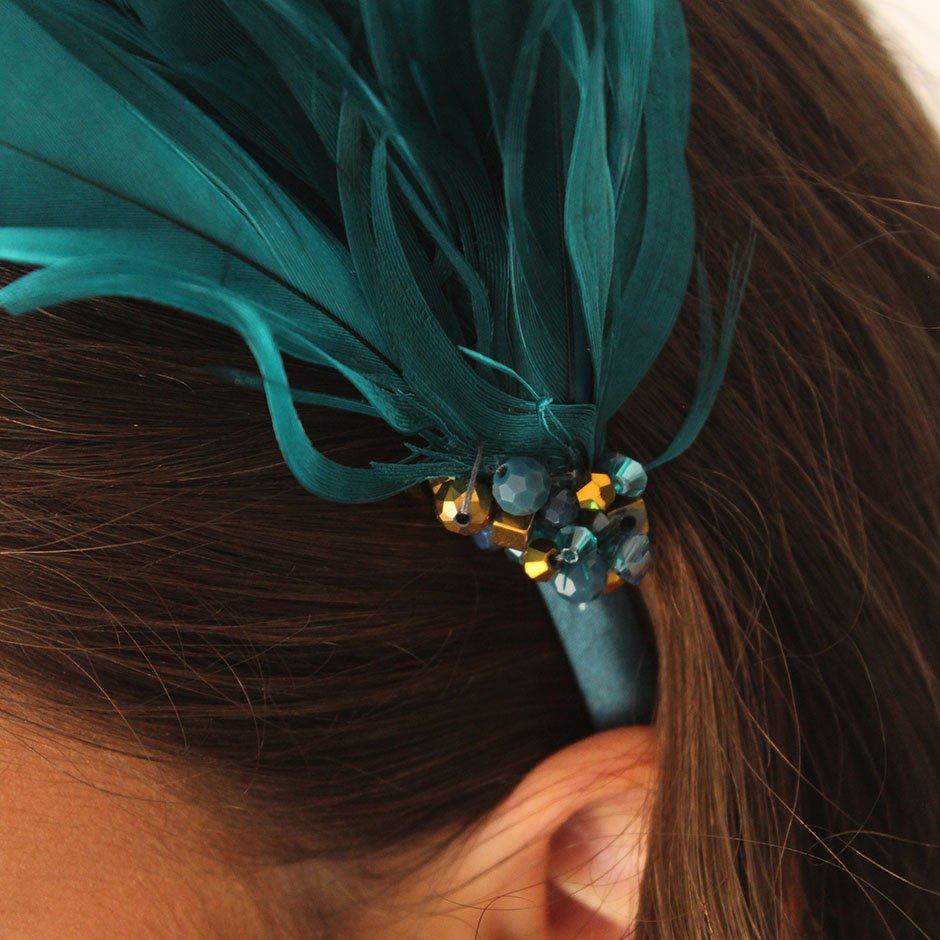 Bandolete da linha cerimónia em tons verde petróleo e dourado. Bandolete fina forrada a cetim , decorada lateralmente com pumo de penas naturais no mesmo tom verde petróleo, bordada comcristais swarovsky facetados.
