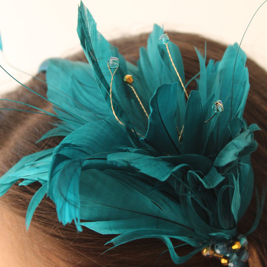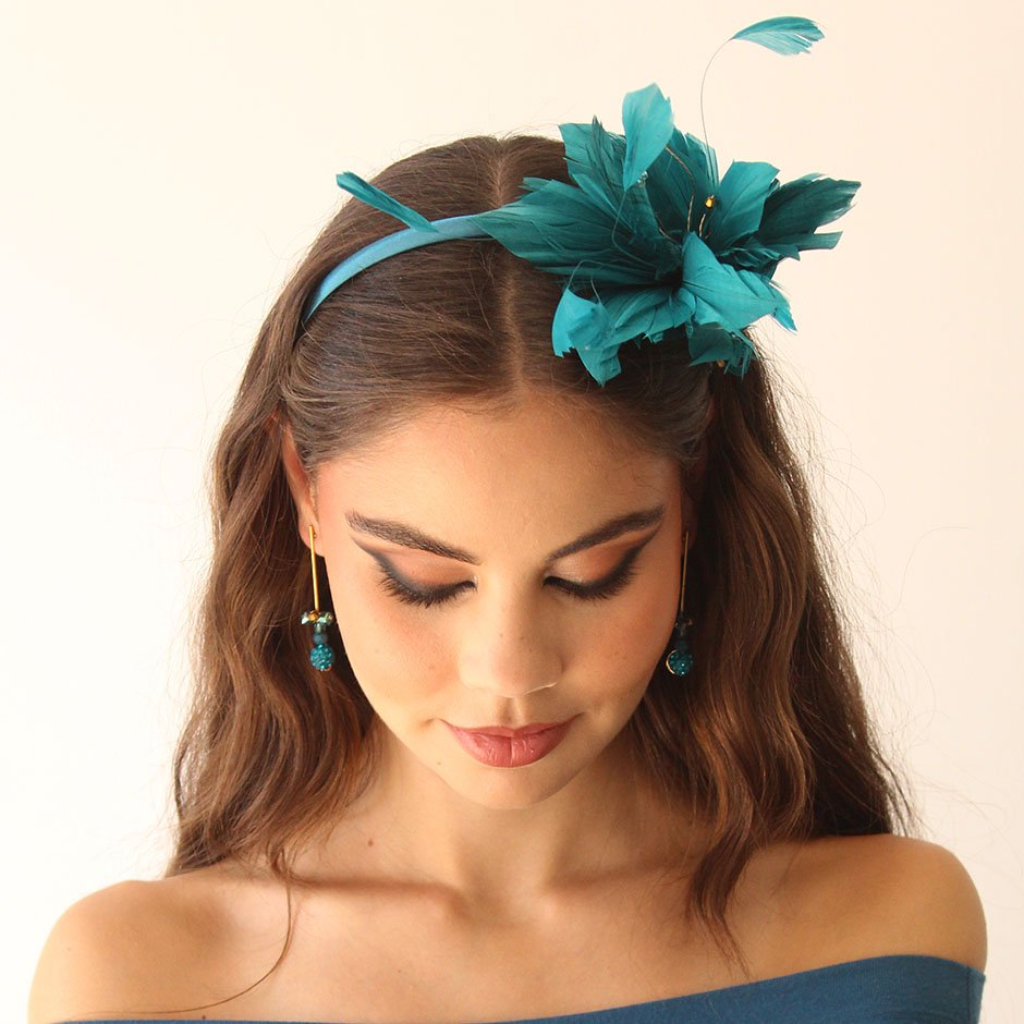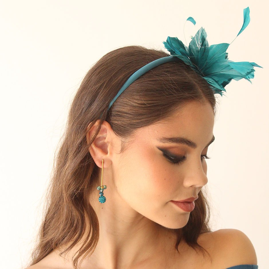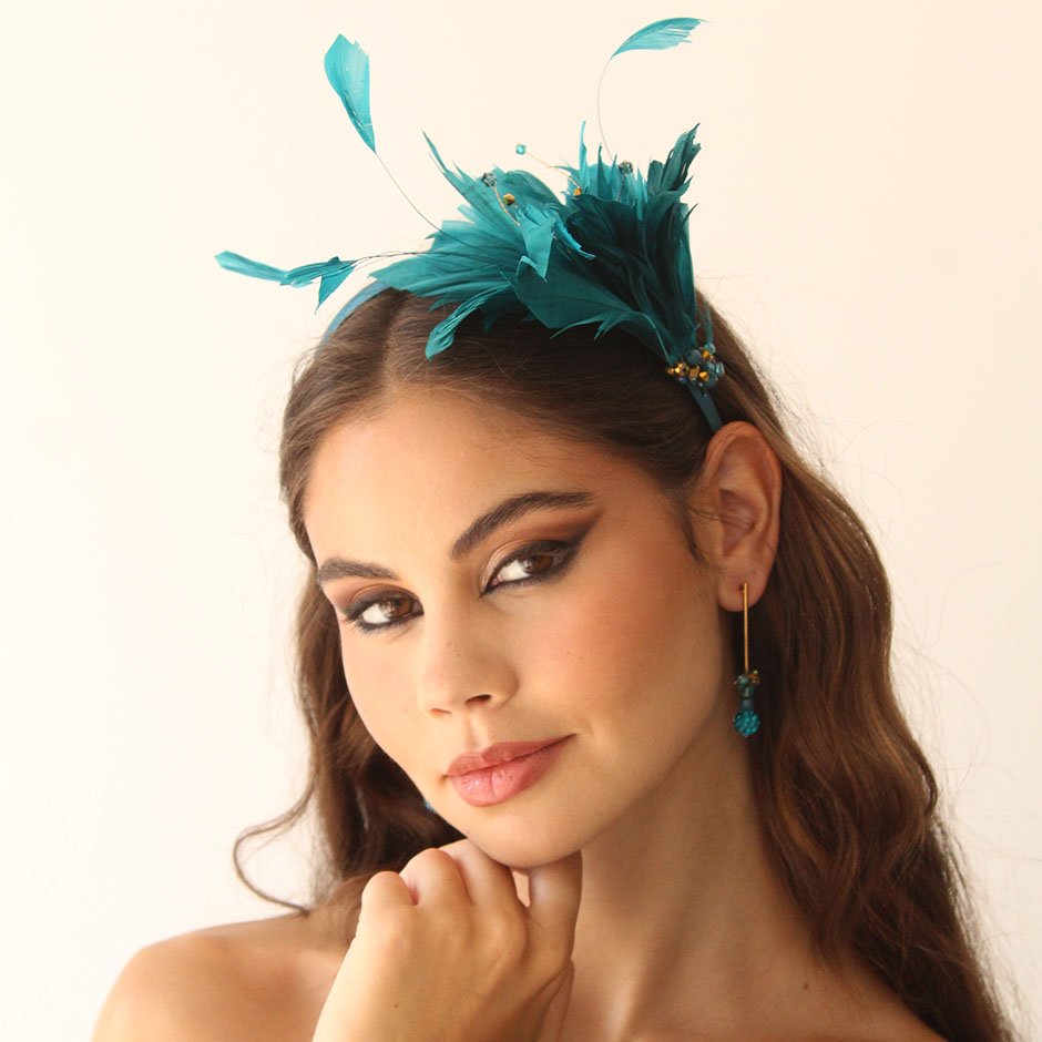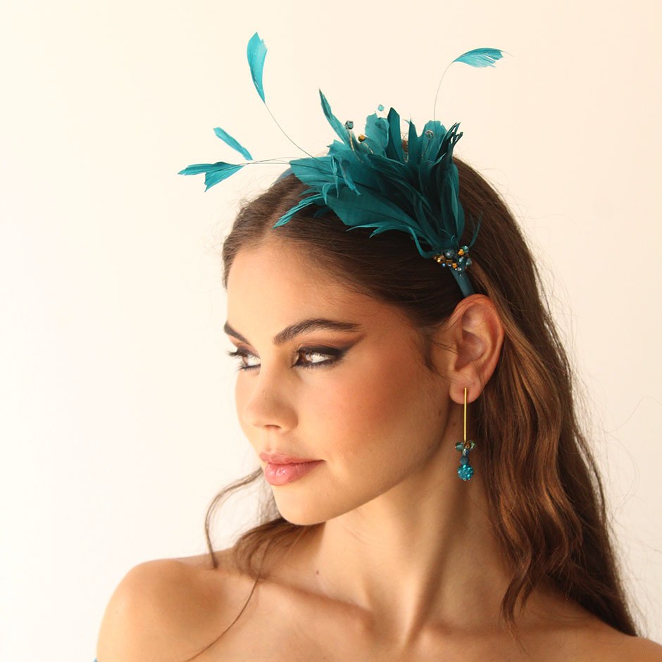 Bandolete da linha cerimónia em tons verde petróleo e dourado. Bandolete fina forrada a cetim , decorada lateralmente com pumo de penas naturais no mesmo tom verde petróleo, bordada comcristais swarovsky facetados.