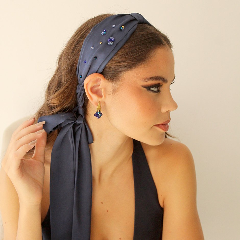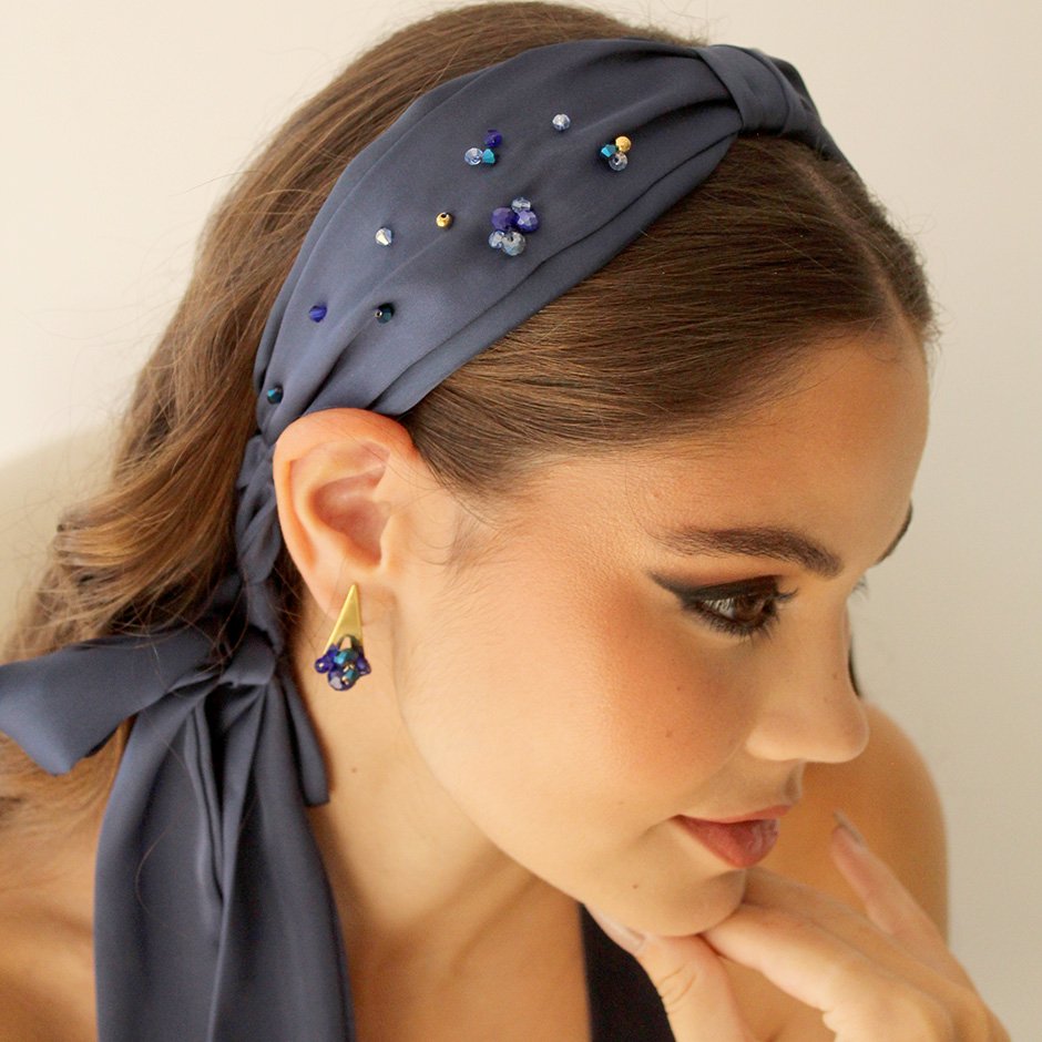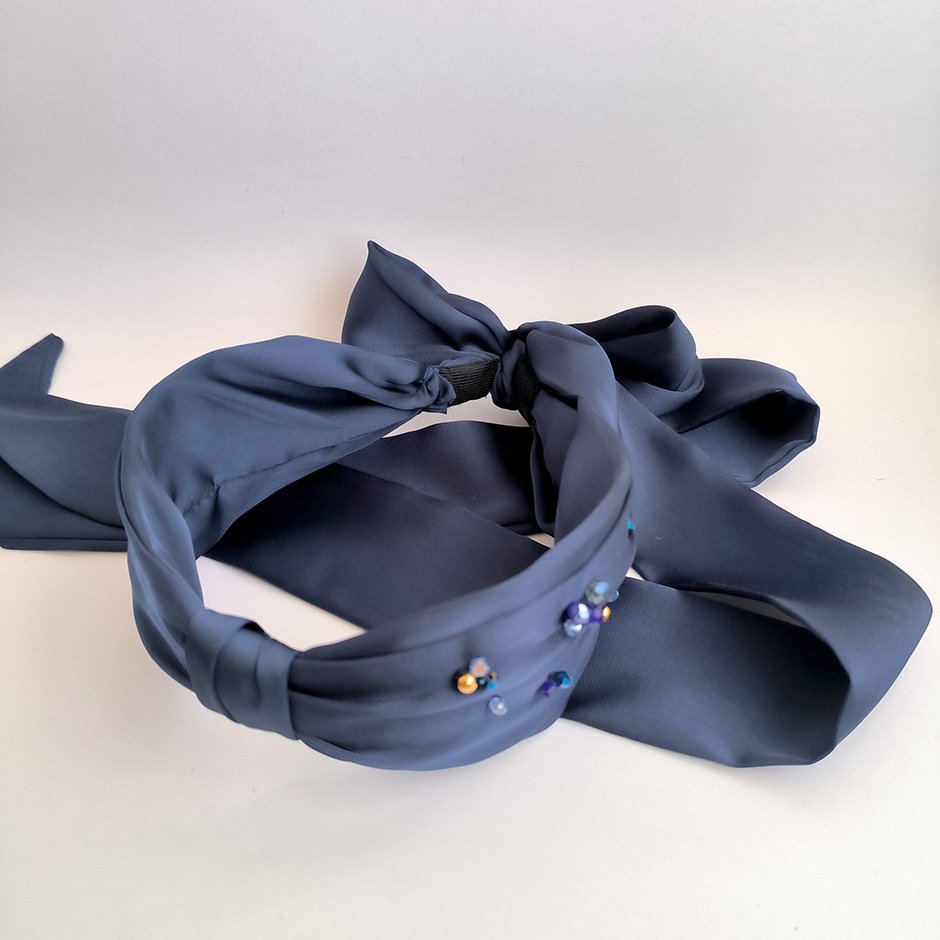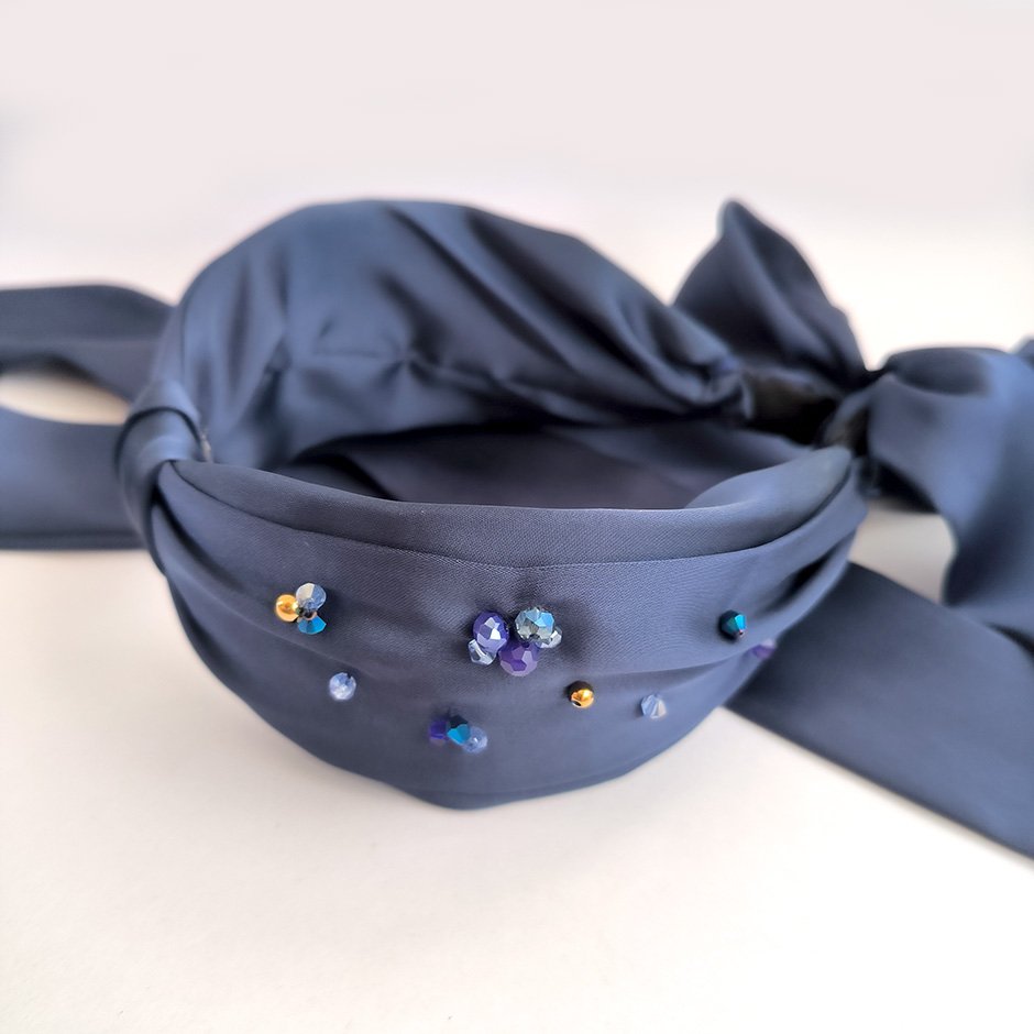 Bandolete da linha casual , em tons azul marinho e dourado. Bordada lateralmente com esferas em aço e cristais swarovsky facetados. Com fita longa em tecido acetinado, permite fechar em laço, atrás ou lateralmente.