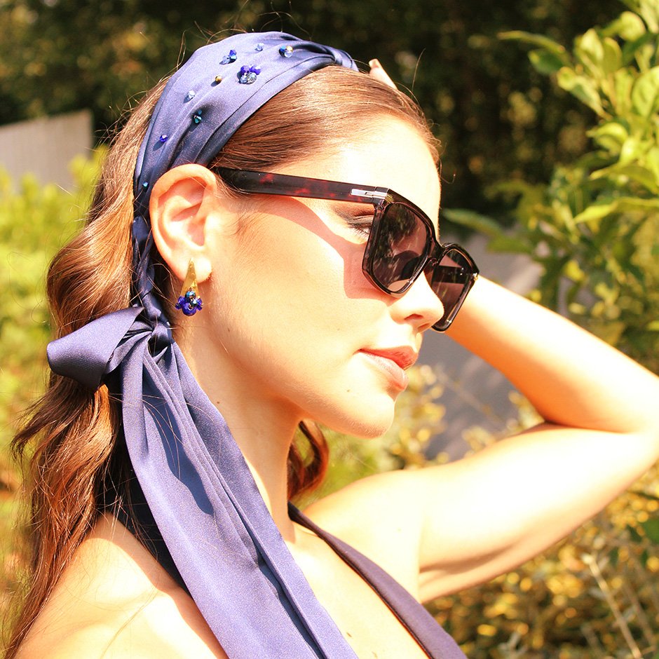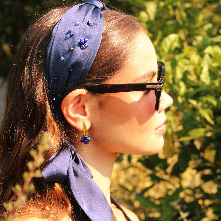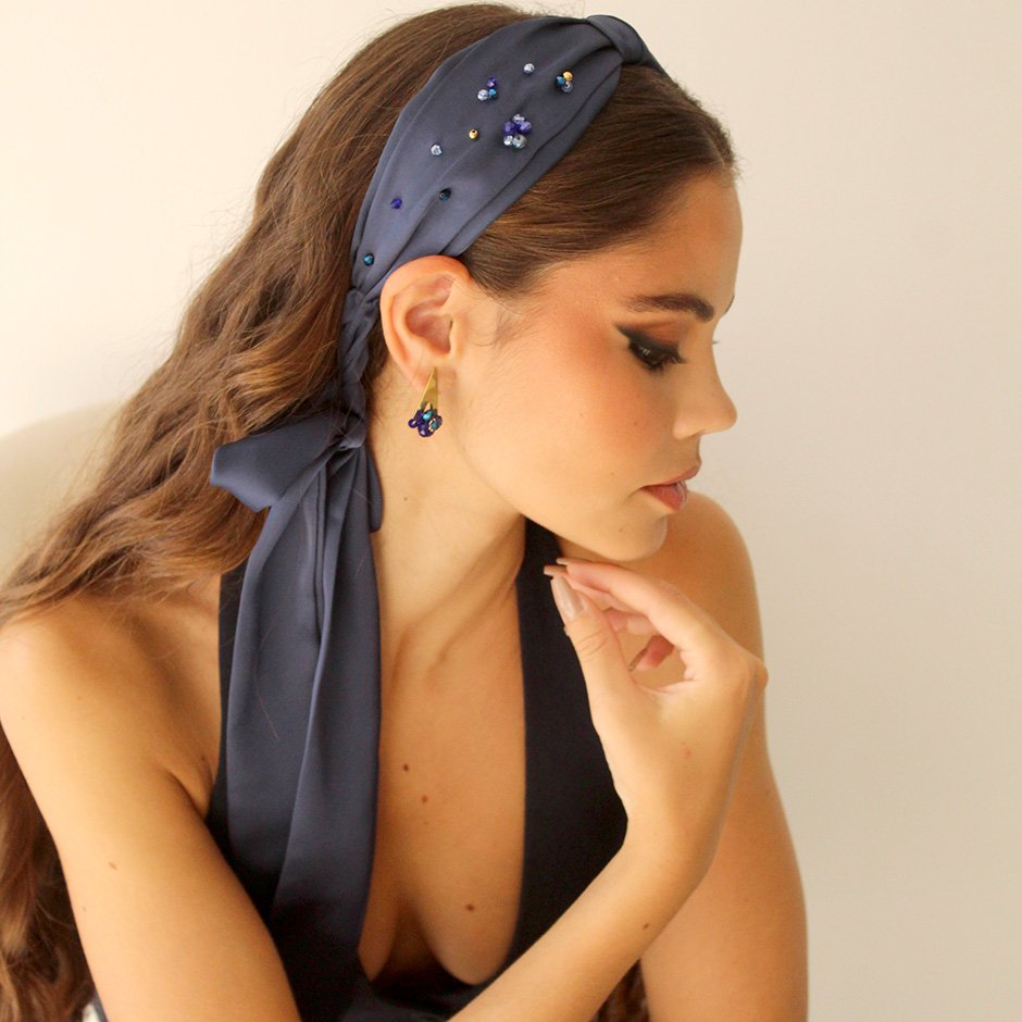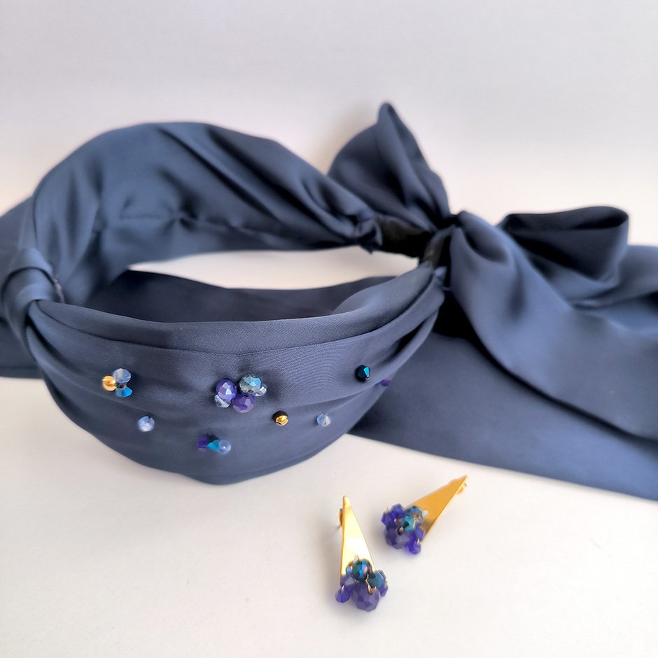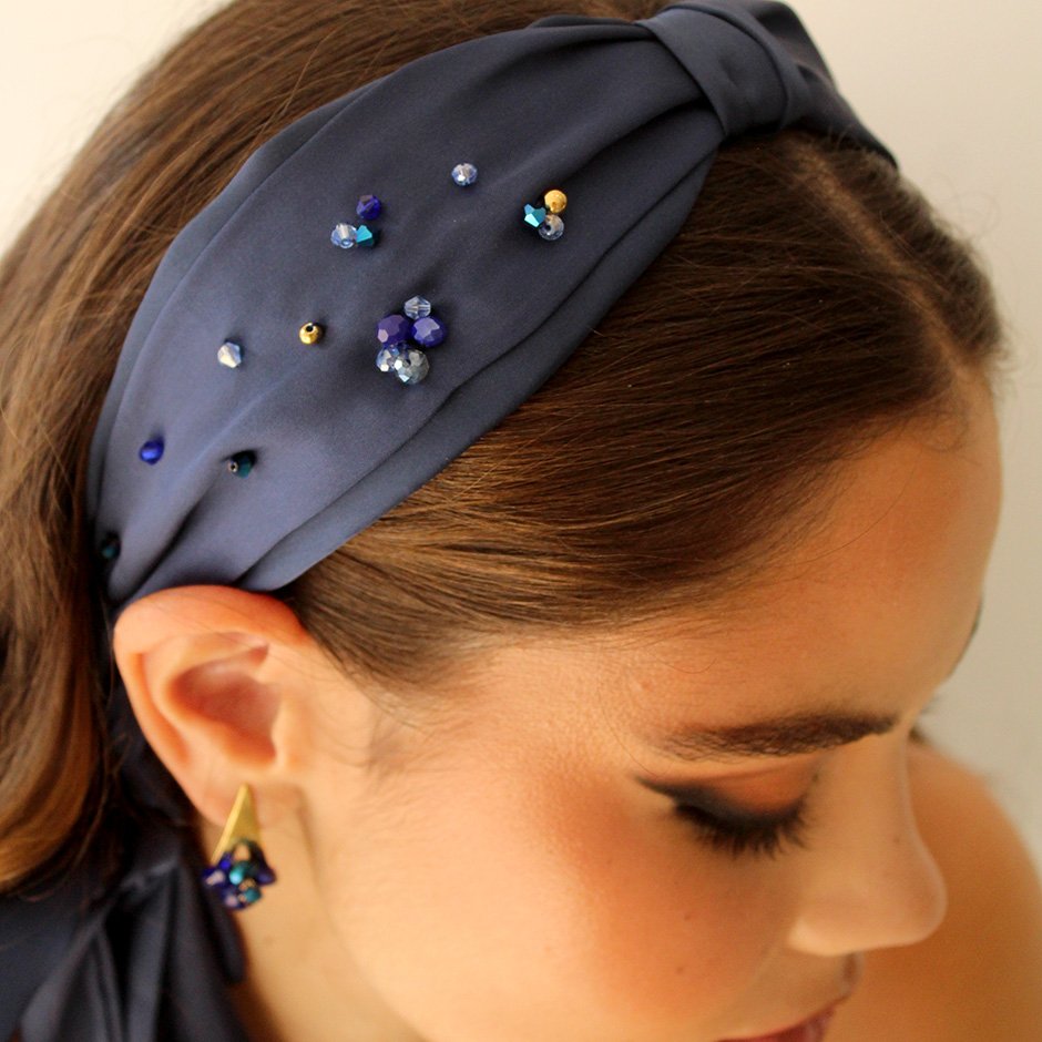 Bandolete da linha casual , em tons azul marinho e dourado. Bordada lateralmente com esferas em aço e cristais swarovsky facetados. Com fita longa em tecido acetinado, permite fechar em laço, atrás ou lateralmente.