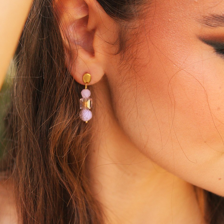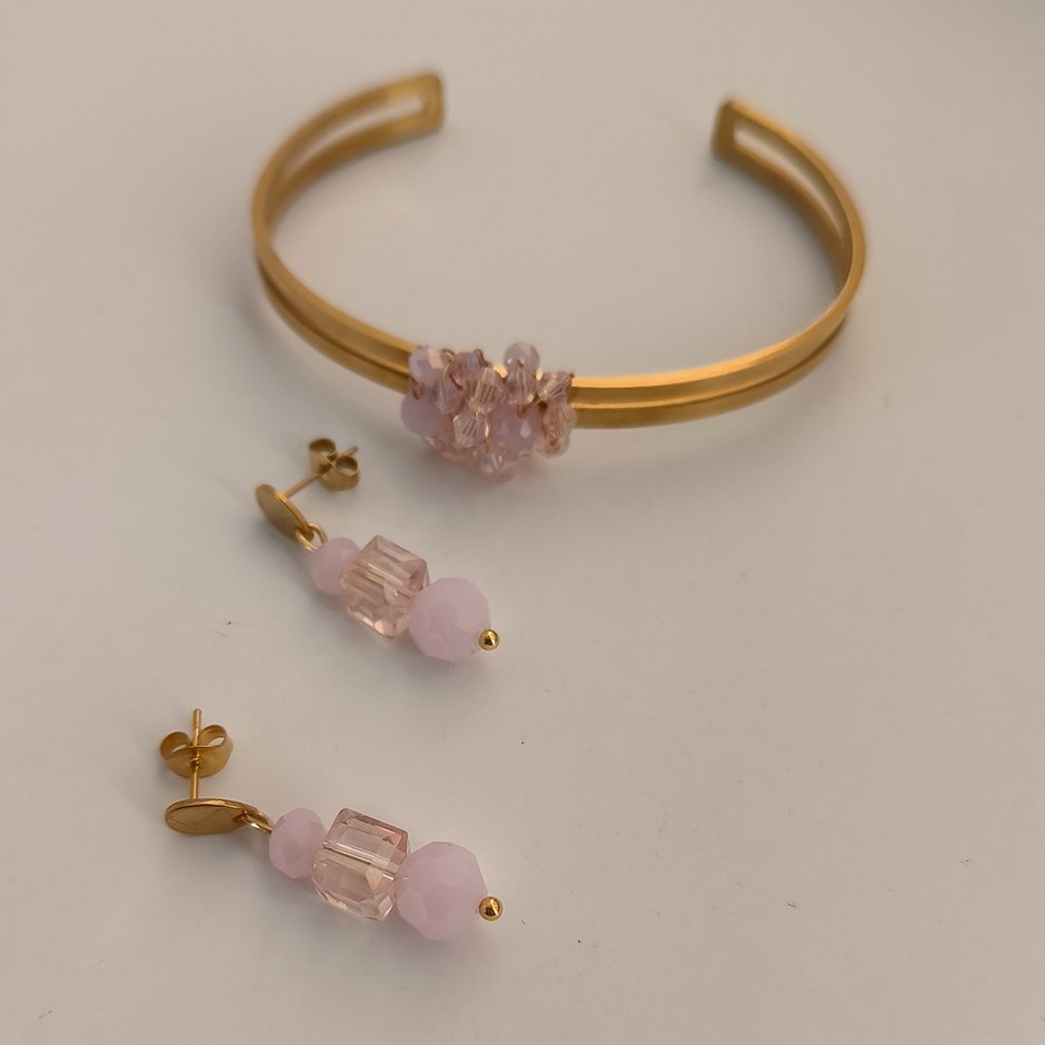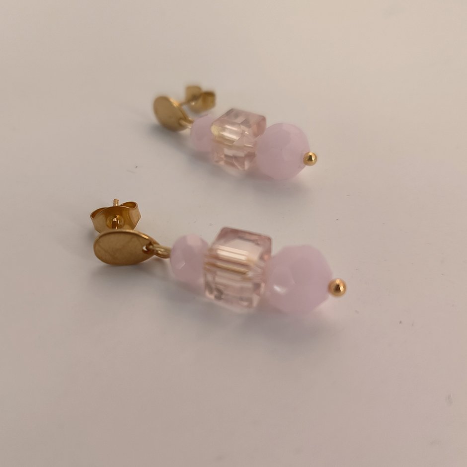 Brincos da linha casual/cerimónia, em tons dourado e rosa. Com base e espigão em aço, com pino também em aço e cristais swarovsky facetados.