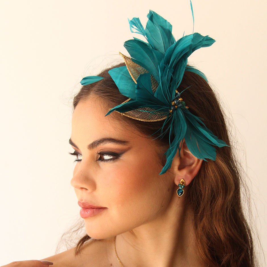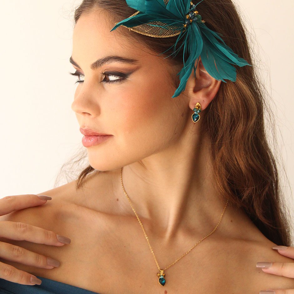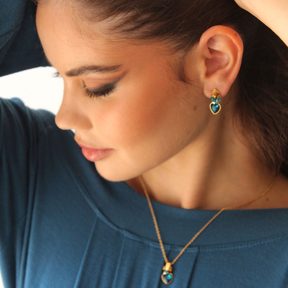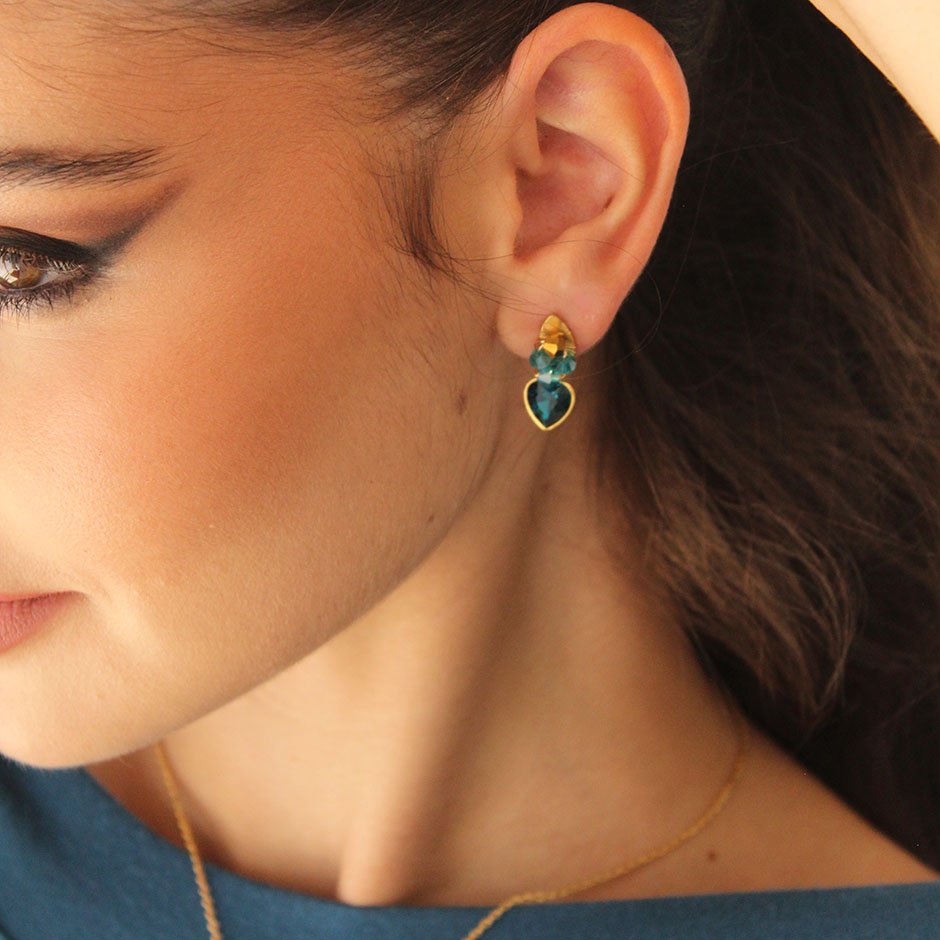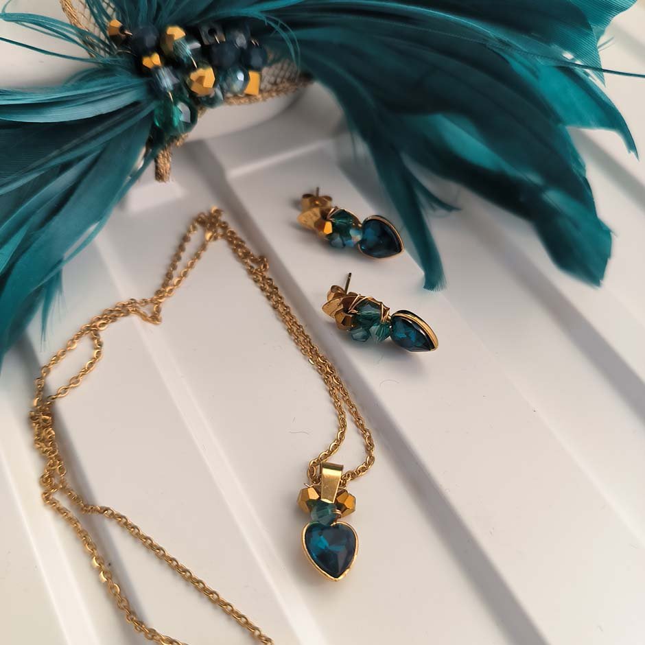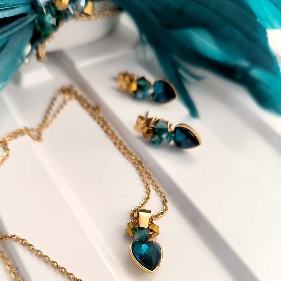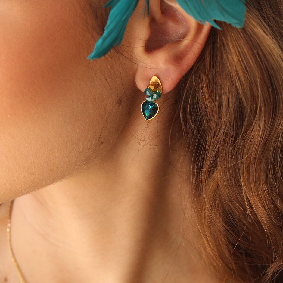 Brincos da linha casual/cerimónia em tons dourado e verde petróleo. Com base e espigão em aço, com coração em cristal facetado, aço e cristais swarovsky facetados.