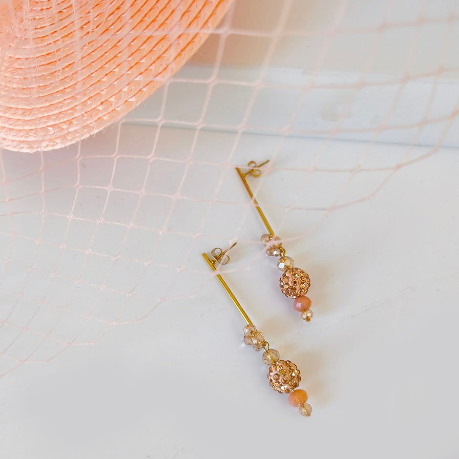 Brincos da linha cerimónia, em tons laranja claro, coral e dourado. Com base e espigão em aço. Com esfera em cerâmica encrustada com zircónias e cristais swarovsky facetados.