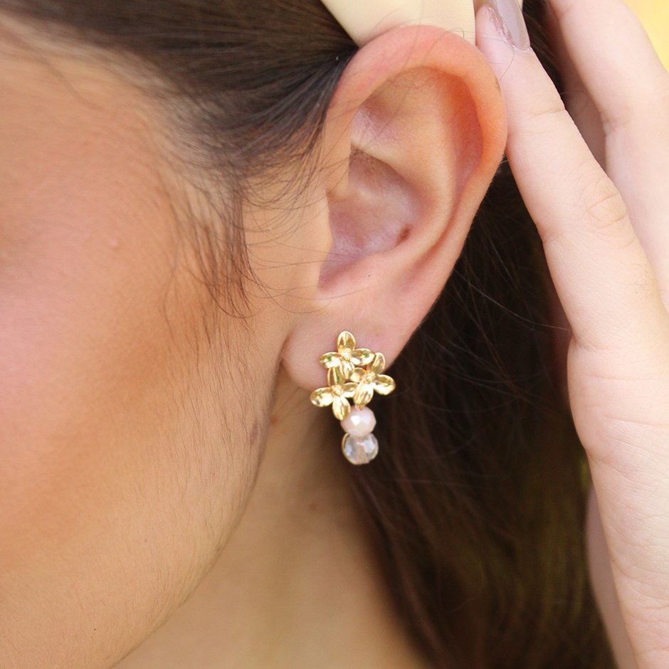 Brincos da linha cerimónia, em tons dourado e beje. Com topo em metal banhado a ouro de 18kl, definido pela conjugação de 3 flores unidas, rematados por cristal opaco beje e cristais swarosky facetados transparentes.