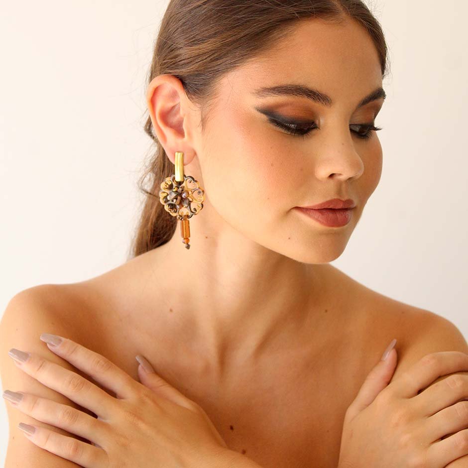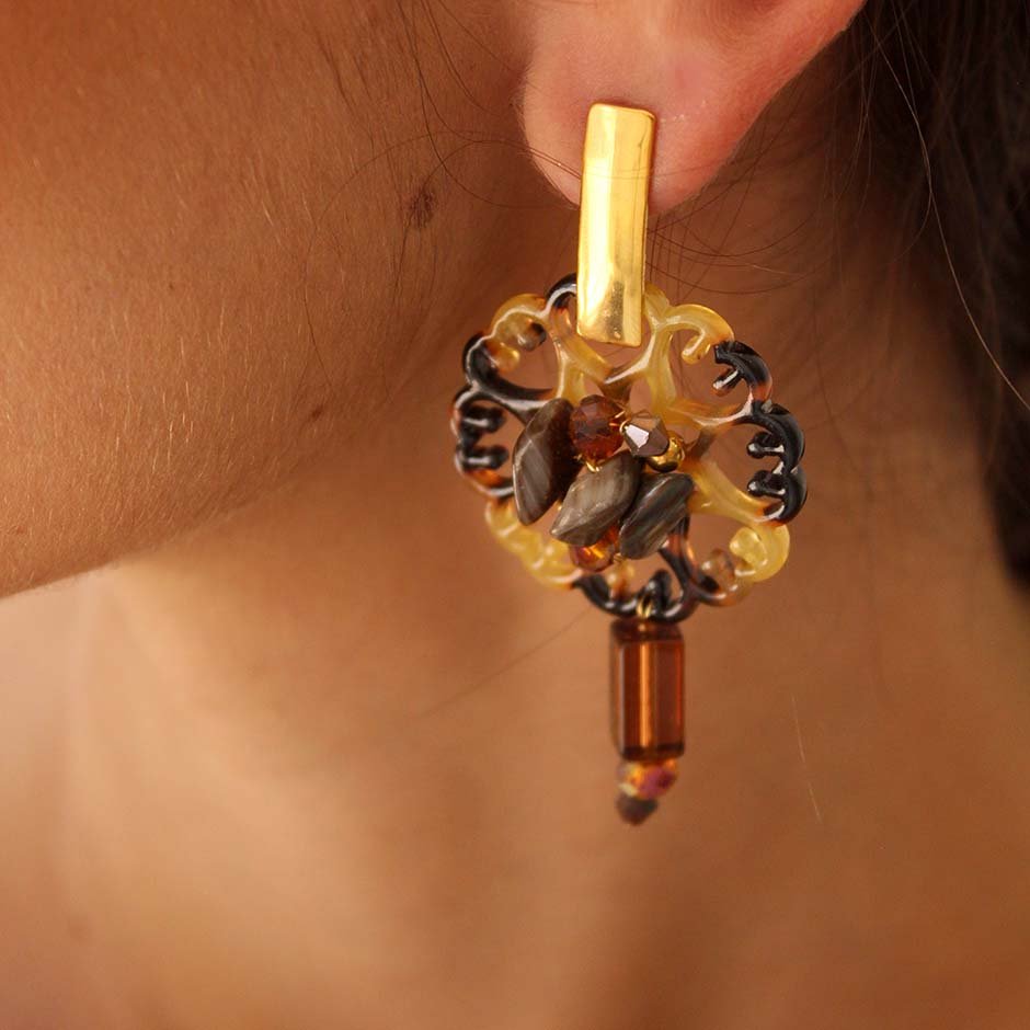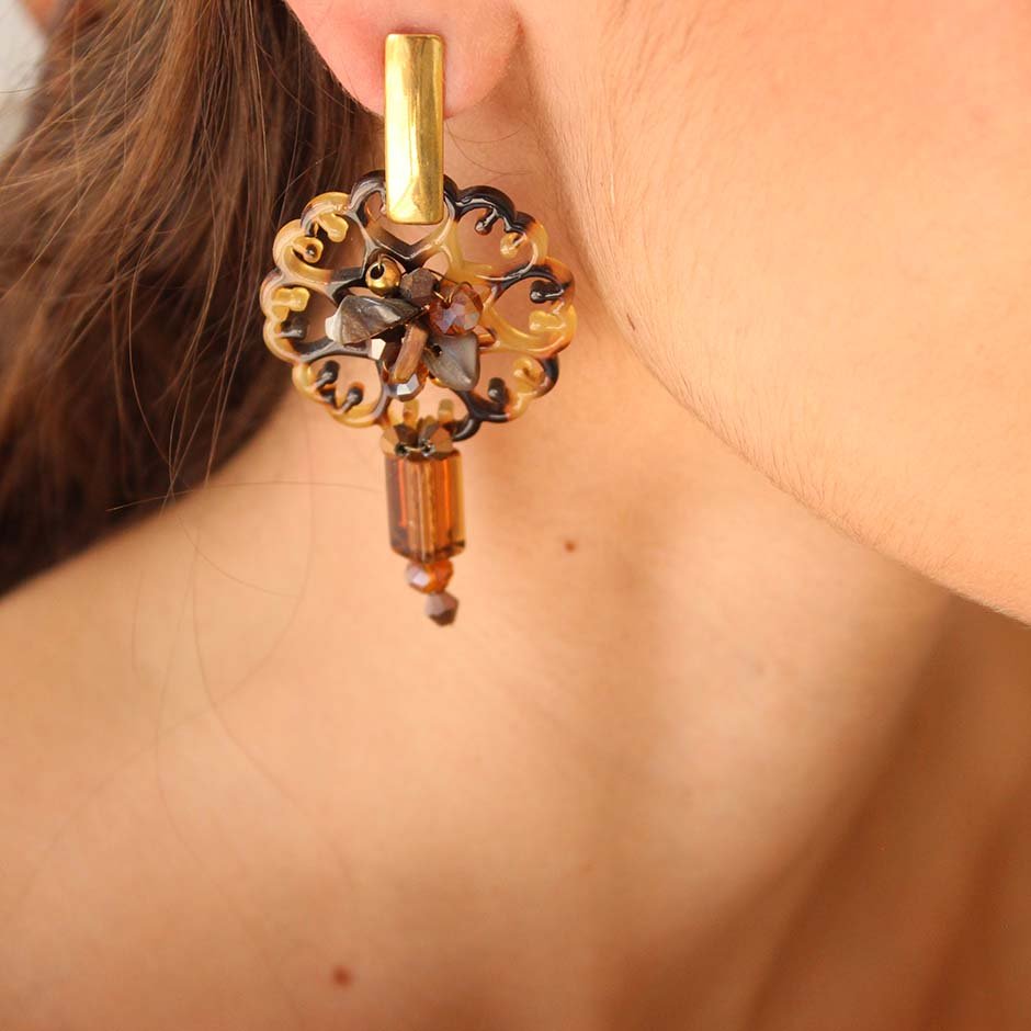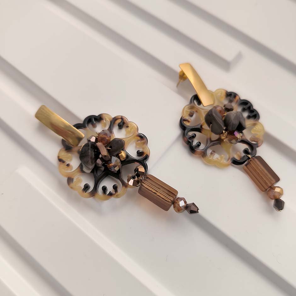Brincos da linha casual , em tons de castanho. Com base e espigão em aço, peça rendilhada ao centro em acrilico matizado, bordada com cristais swarovsky facetados e pedra frio. Rematados com peça alongada em vidro.
