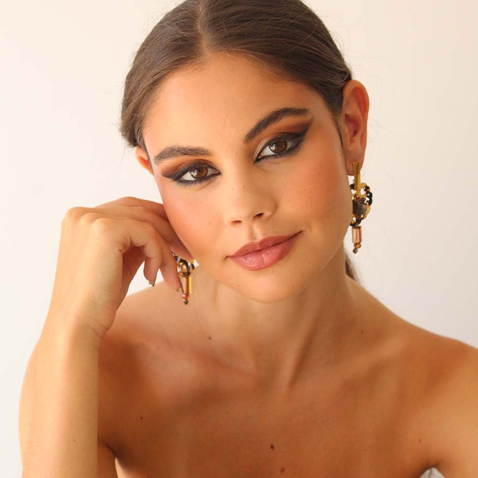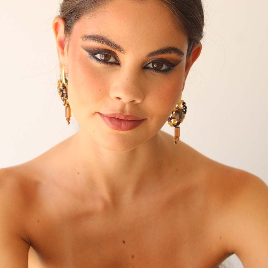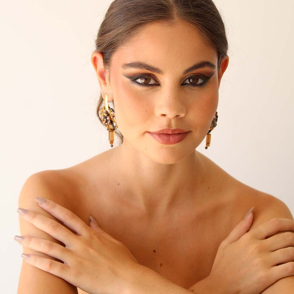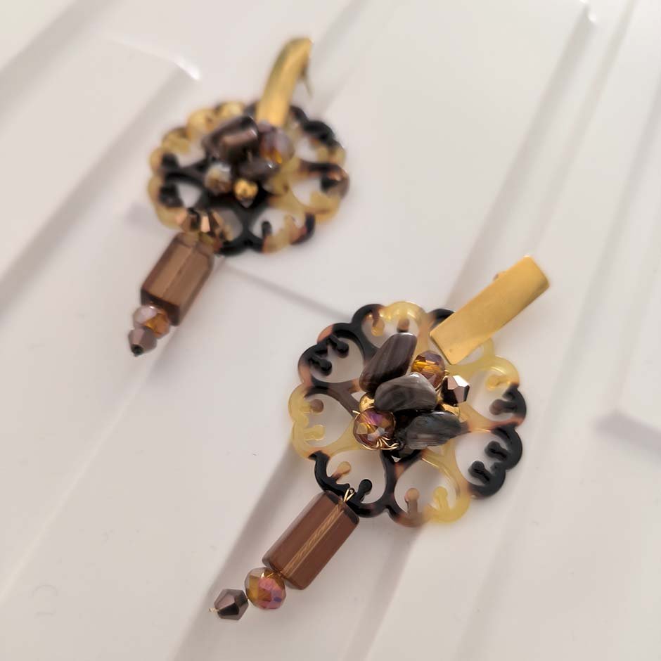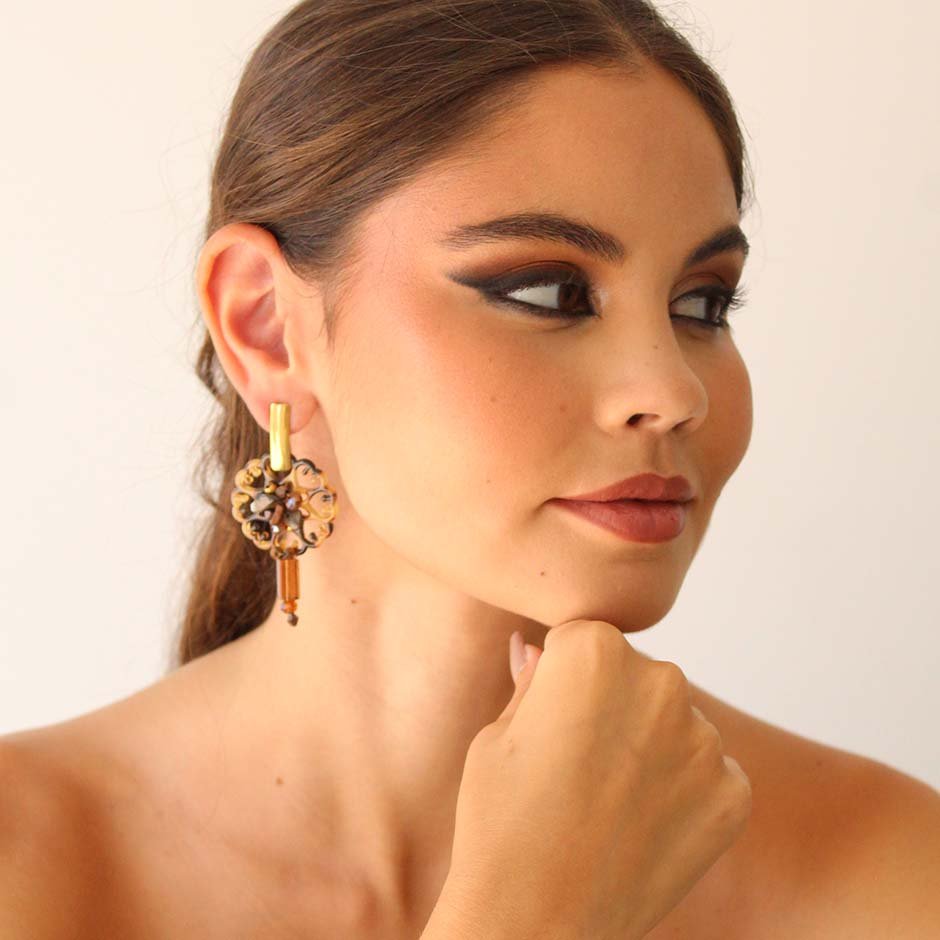 Brincos da linha casual , em tons de castanho. Com base e espigão em aço, peça rendilhada ao centro em acrilico matizado, bordada com cristais swarovsky facetados e pedra frio. Rematados com peça alongada em vidro.