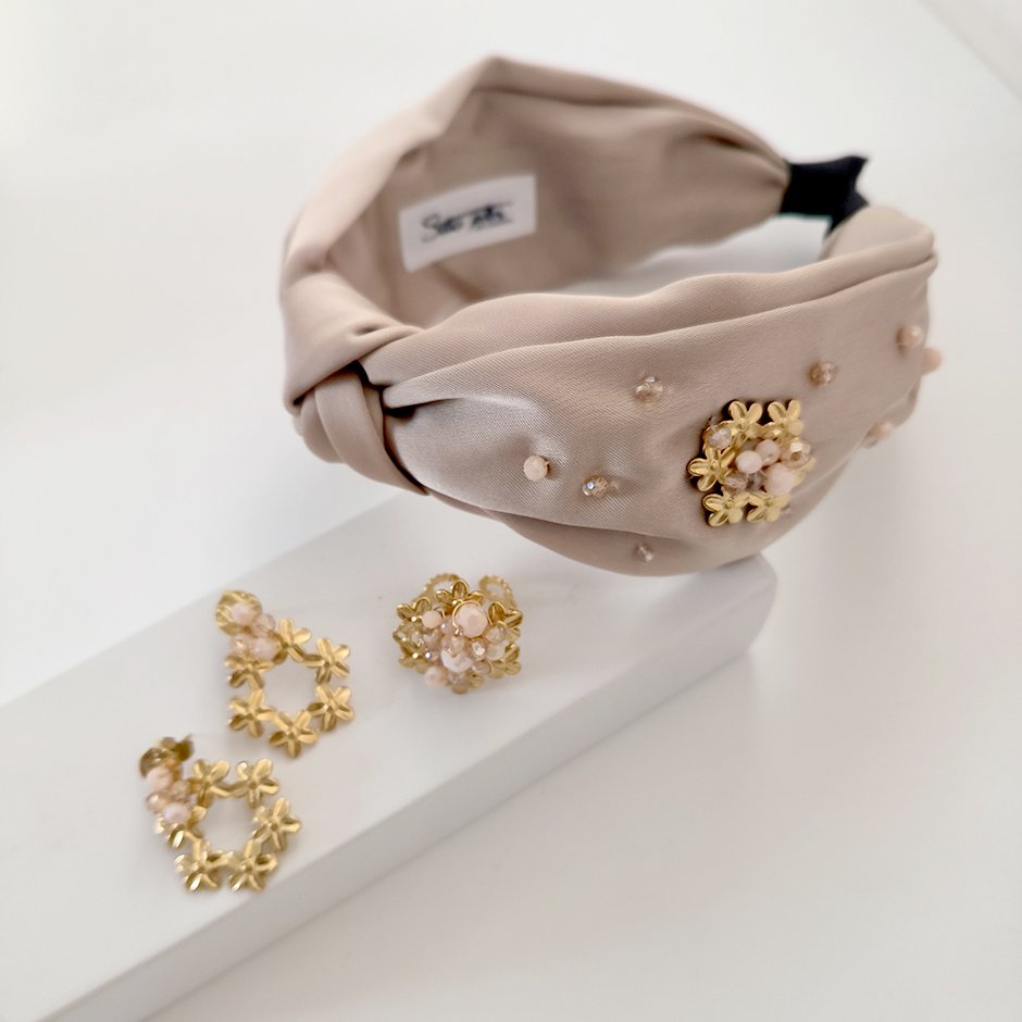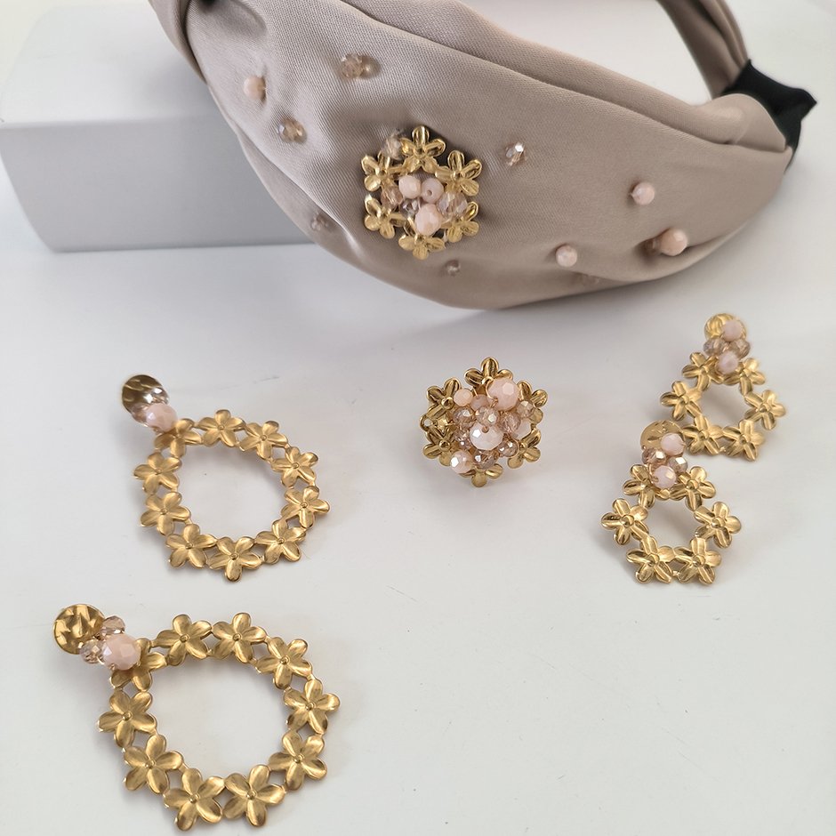 Brincos da linha casual, em tons dourado e beje. Com base e espigão em aço, bordados com cristais swarovsky facetados e rematados com peça em aço, definida por flores. Peça dos brincos repete-se na bandolete e anel que sugem como exmplo de conjunto.