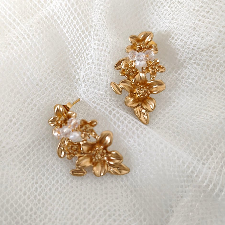 Brincos da linha noiva /cerimónia , em tom dourado. Com base e espigão em aço, peça definida por flores e folhagens, em metal tom dourado. Bordados com cristais swarovsky facetados e pérolas de àgua.