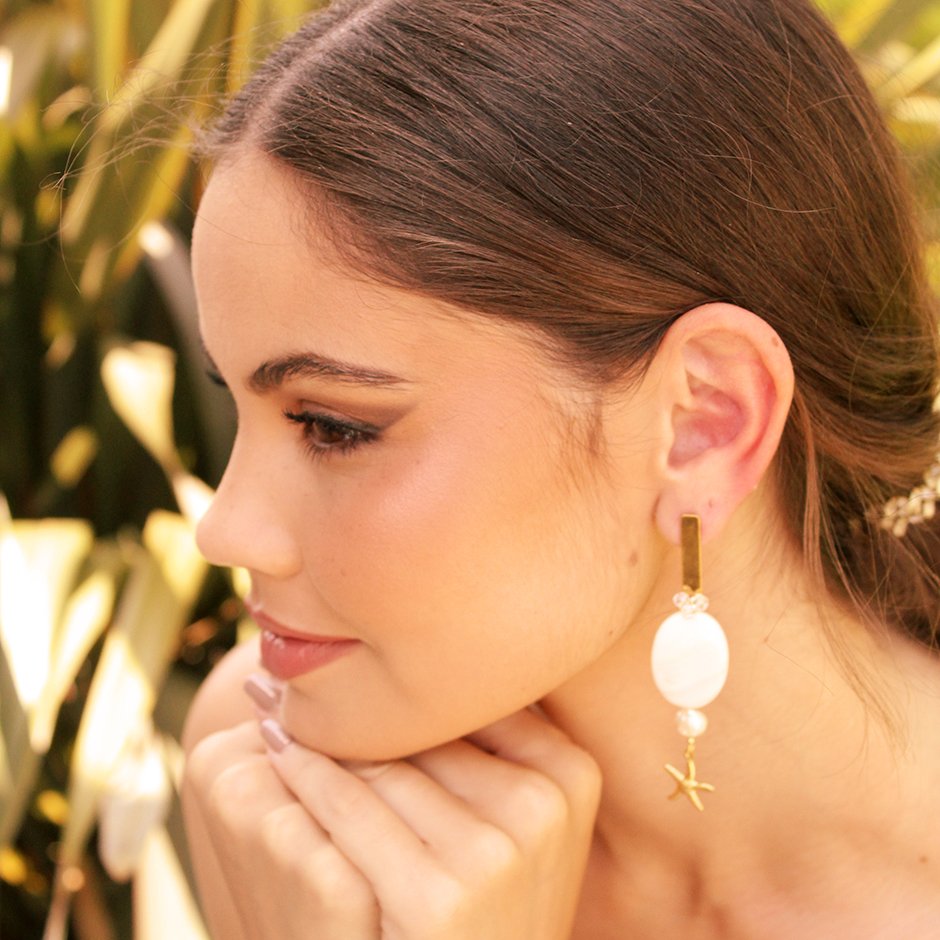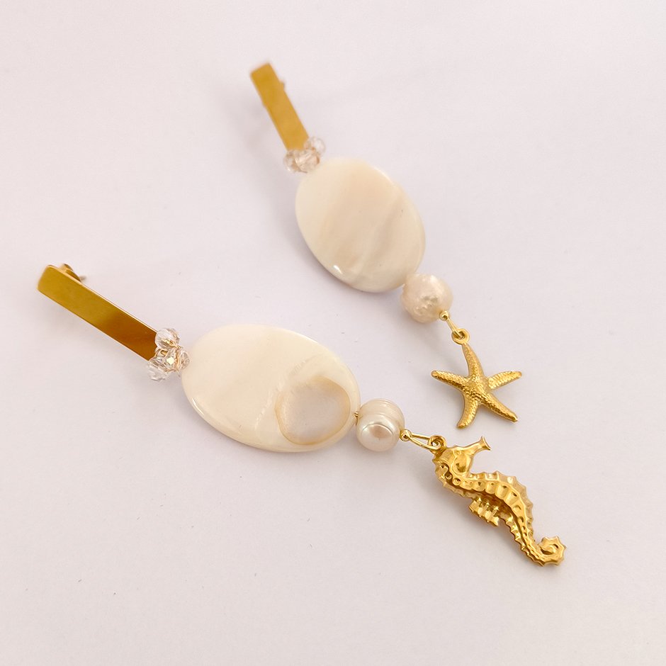 Brincos da linha casual, em tons dourado e branco. Com base em rectangulo alongado e espigão totalmente em aço, com pedra oval em madre pérola, cristais swarovsky facetados e pérolas de àgua. Um rematado com estrela do mar em aço e outro com cavalo marinho também em aço.