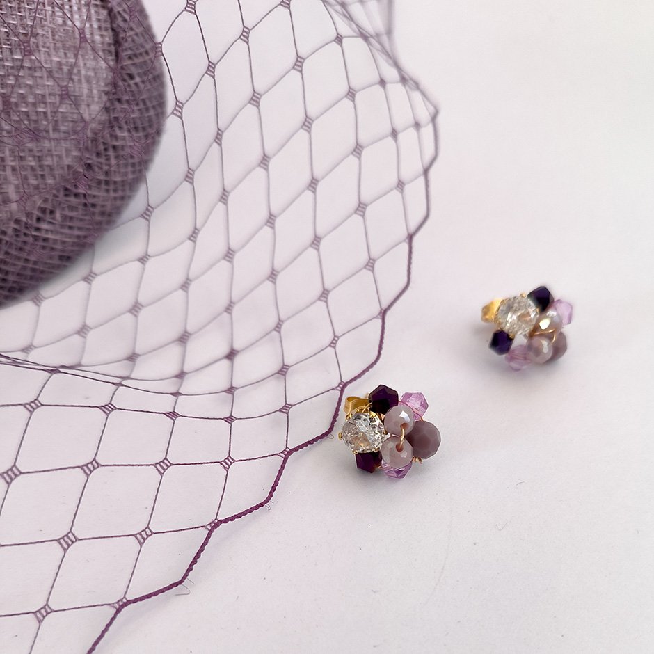 Brincos da linha casual/cerimónia, em tons lilás , roxo e dourado. Com base e espigão em aço, com zircónia ao centro, bordados com cristais swarovsky facetados tom lilás e roxo.