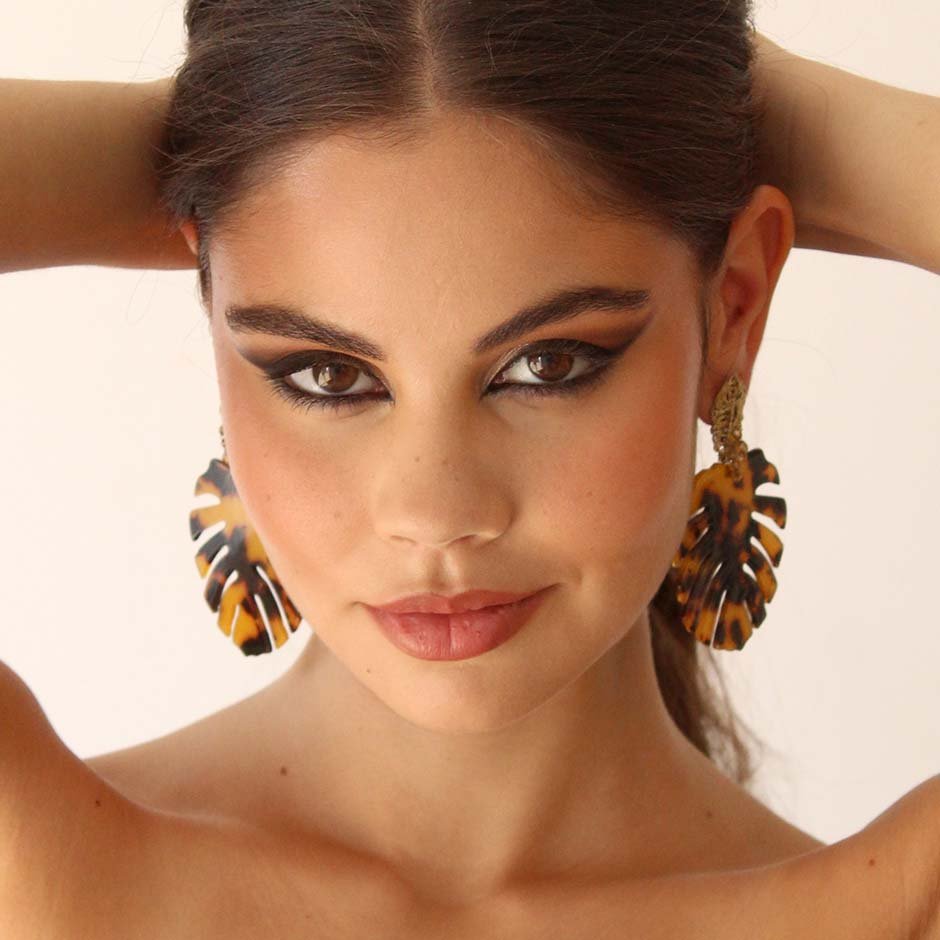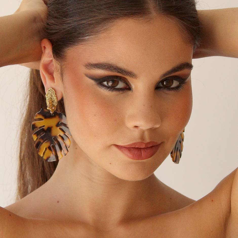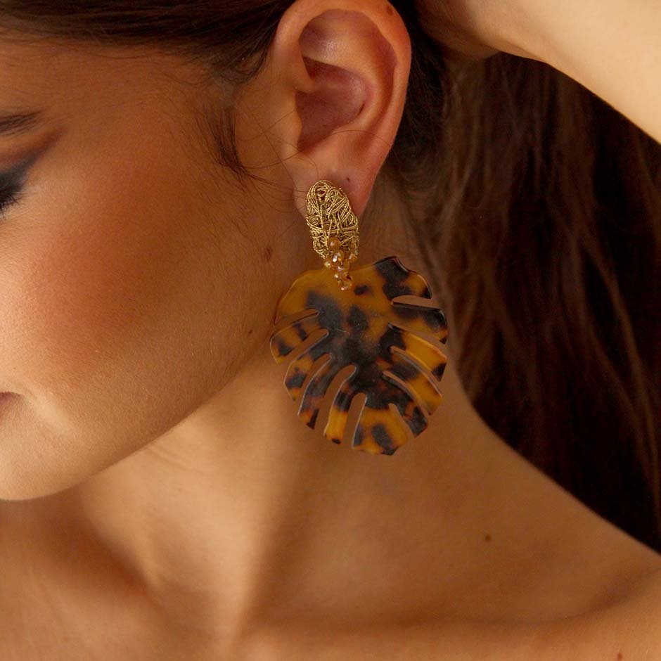 Brincos da linha casual, em tons dourado e castanho. Com base e espigão em aço, com malha, cristais swarovsky facetados e peça acrílica matizada em formato de folha.