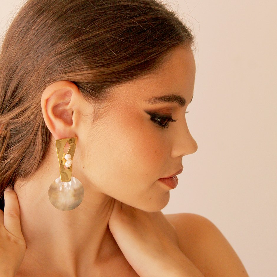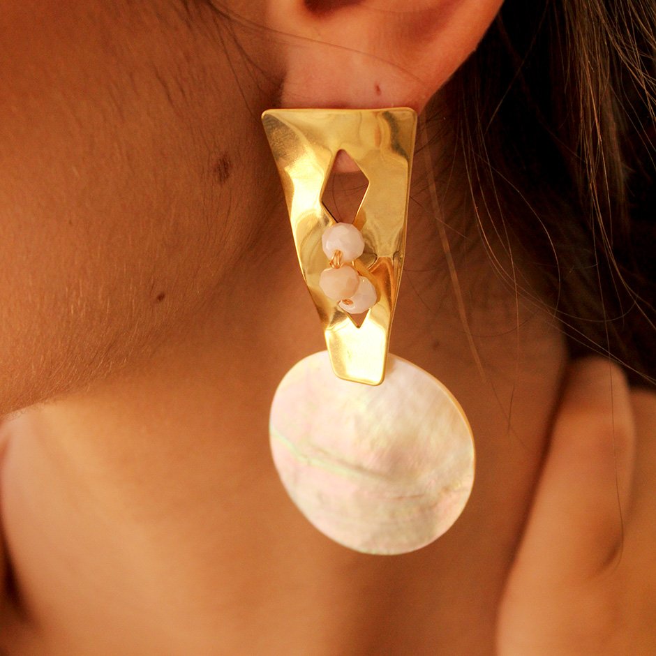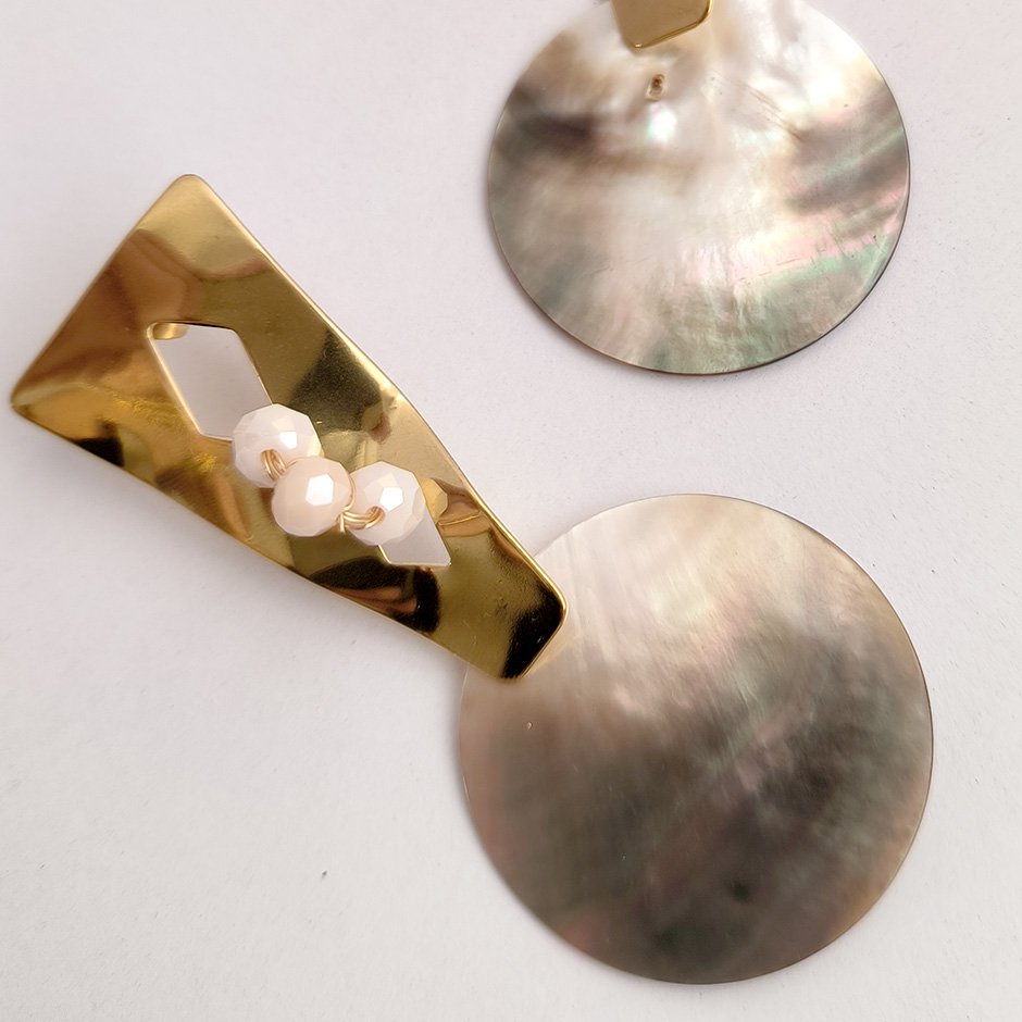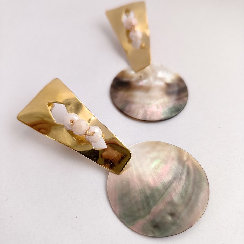 Brincos da linha casual , em tons dourado, beje e madre pérola. Com base e espigão em aço, peça alongada, com aberturas, bordada com cristais swarovsky facetados e rematada com esfera em madre pérola.