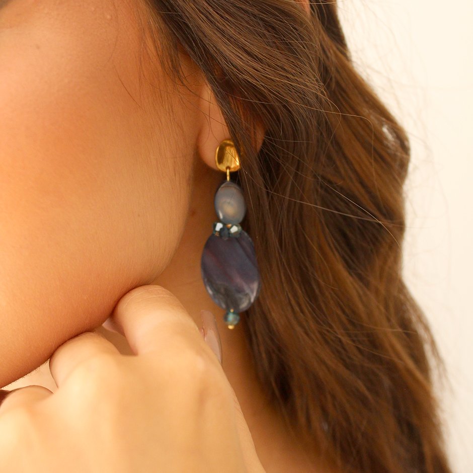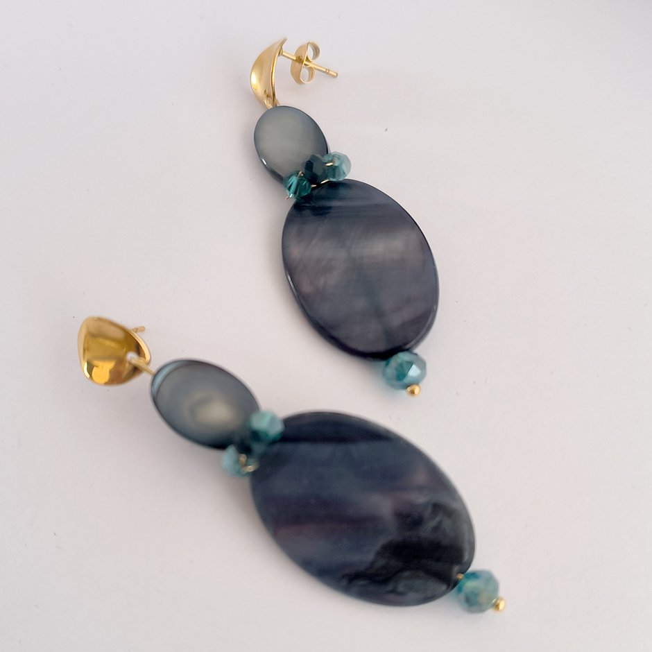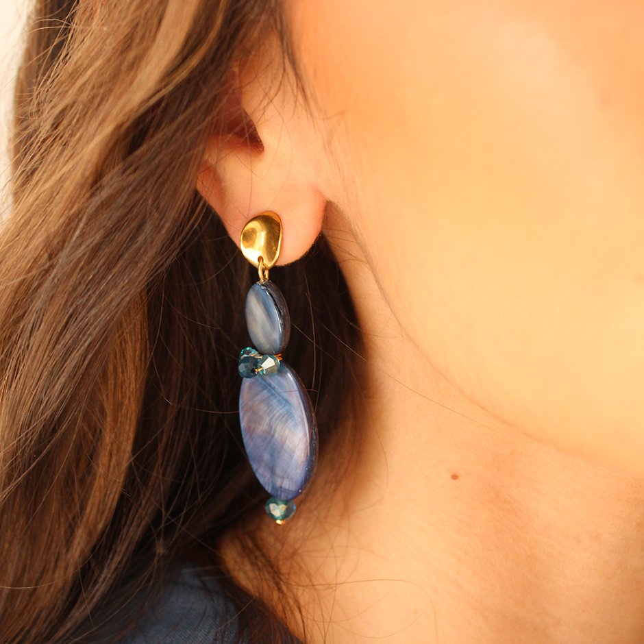 Brincos da linha casual em tons azul e dourado. Com base e espigão em aço, com pedra oval em madre pérola e bordados com cristais swarovsky facetados.