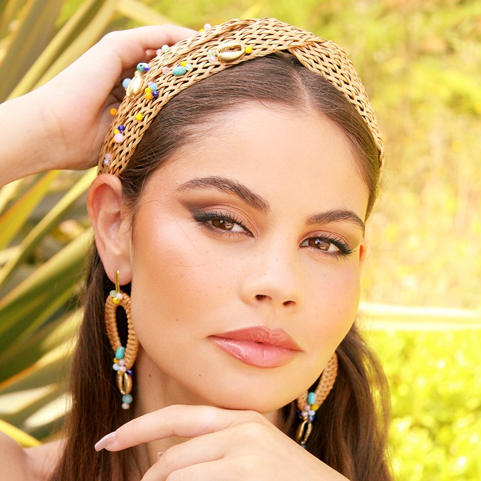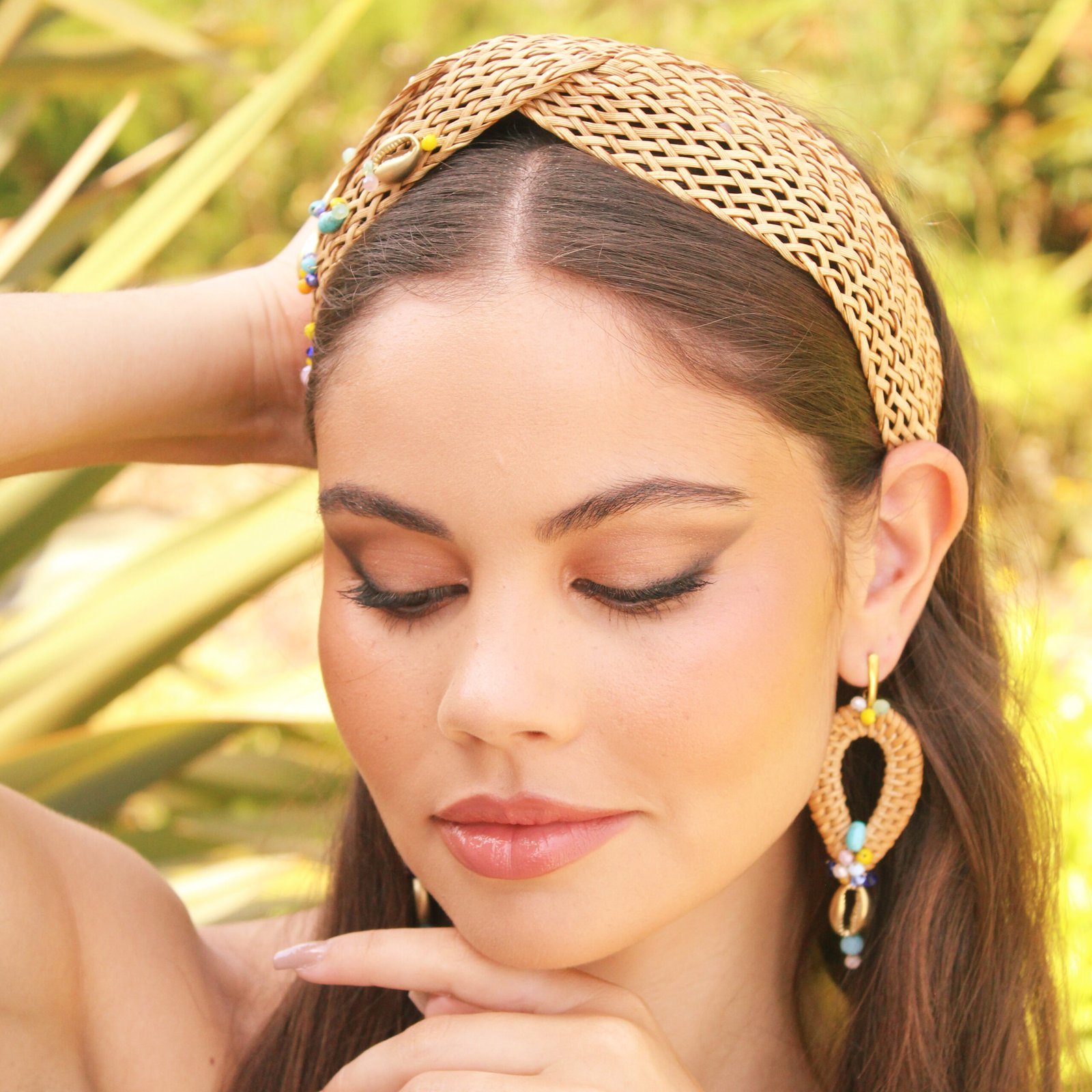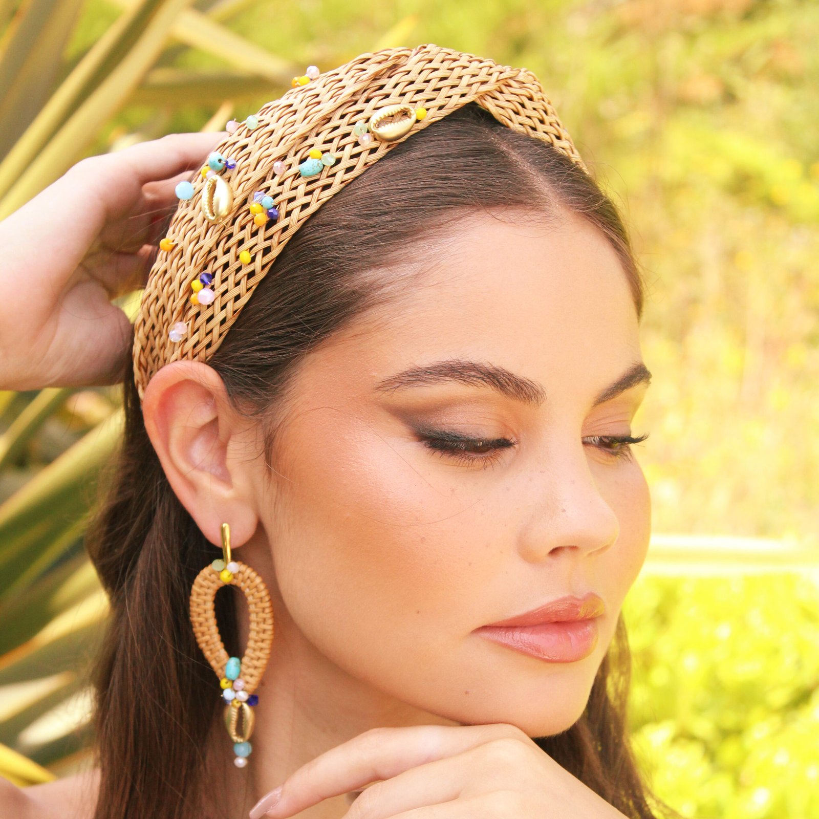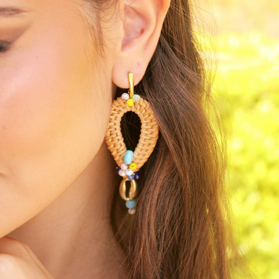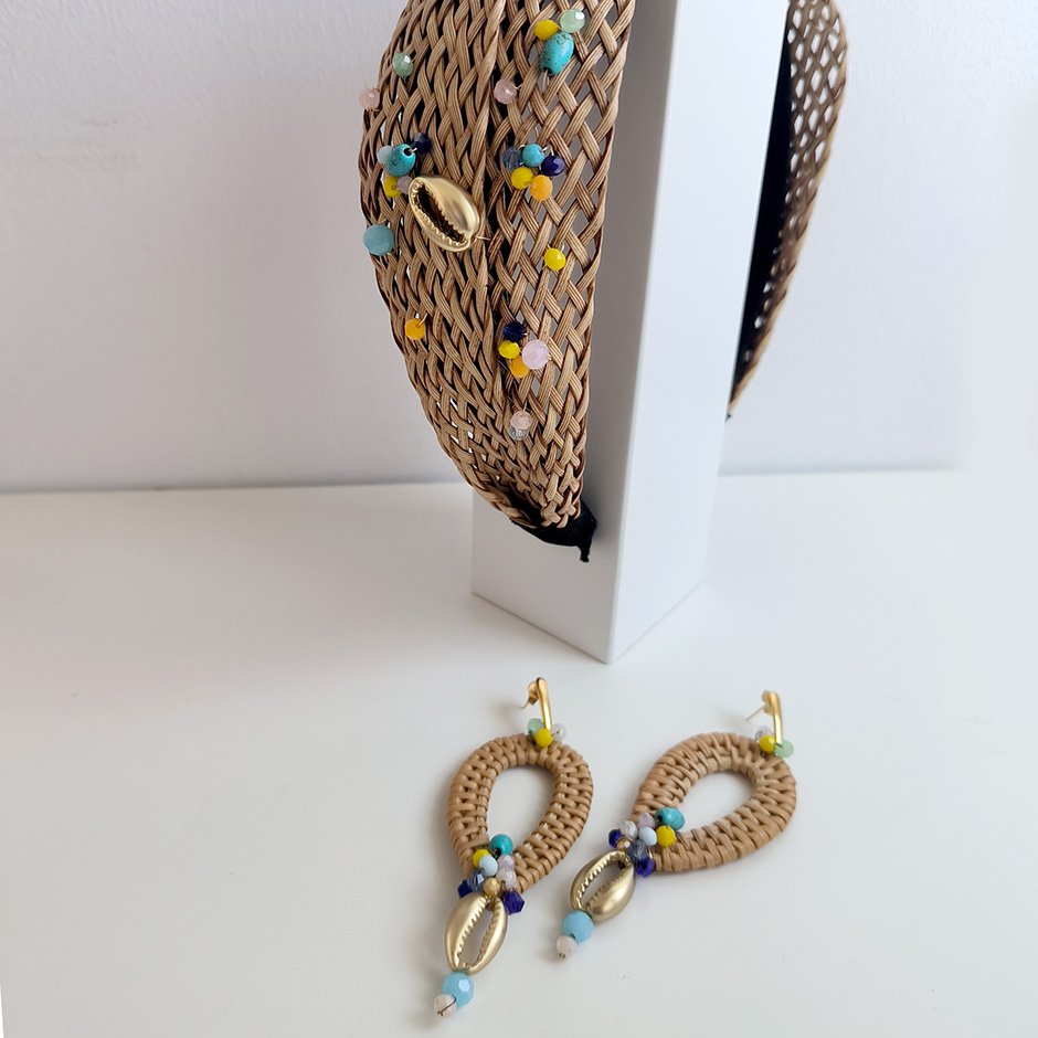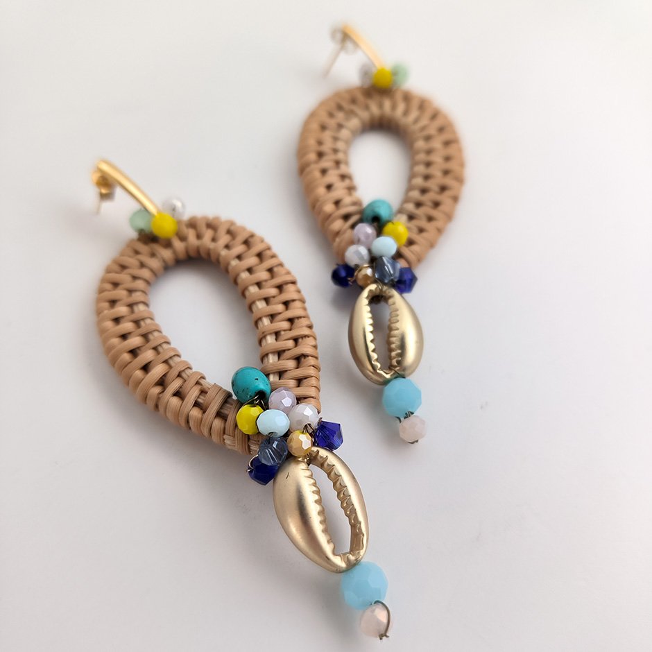 Brincos da coleção casual, em tons crú e multicoloridos. Com base e espigão em aço, com peça em ráfia, bordada com cristais swarovsky facetados, pedra natural e concha metálica.