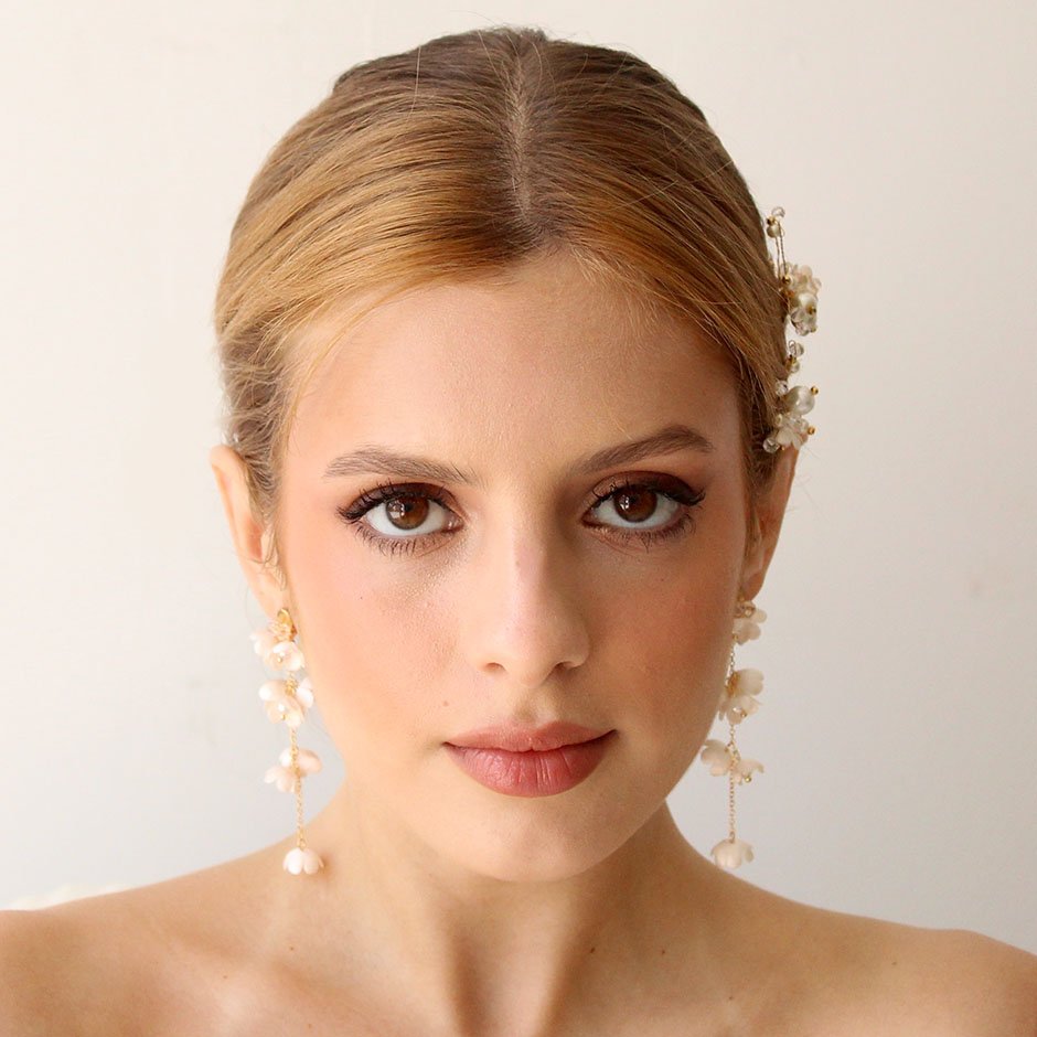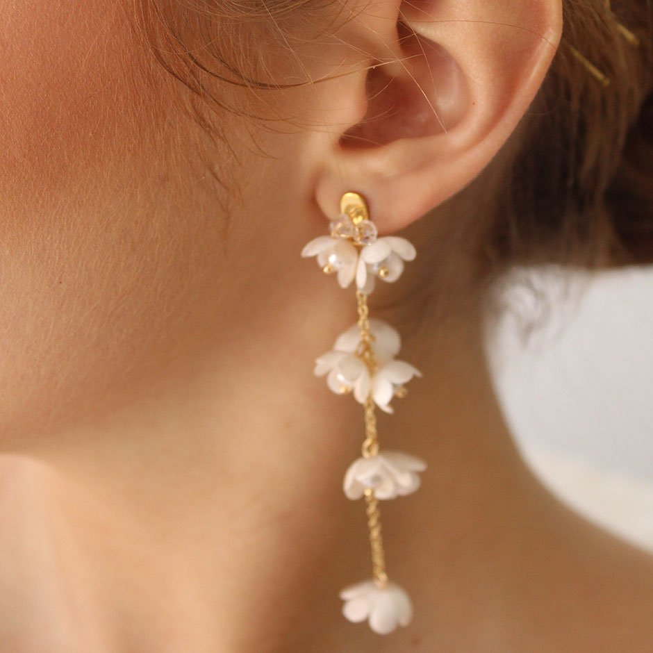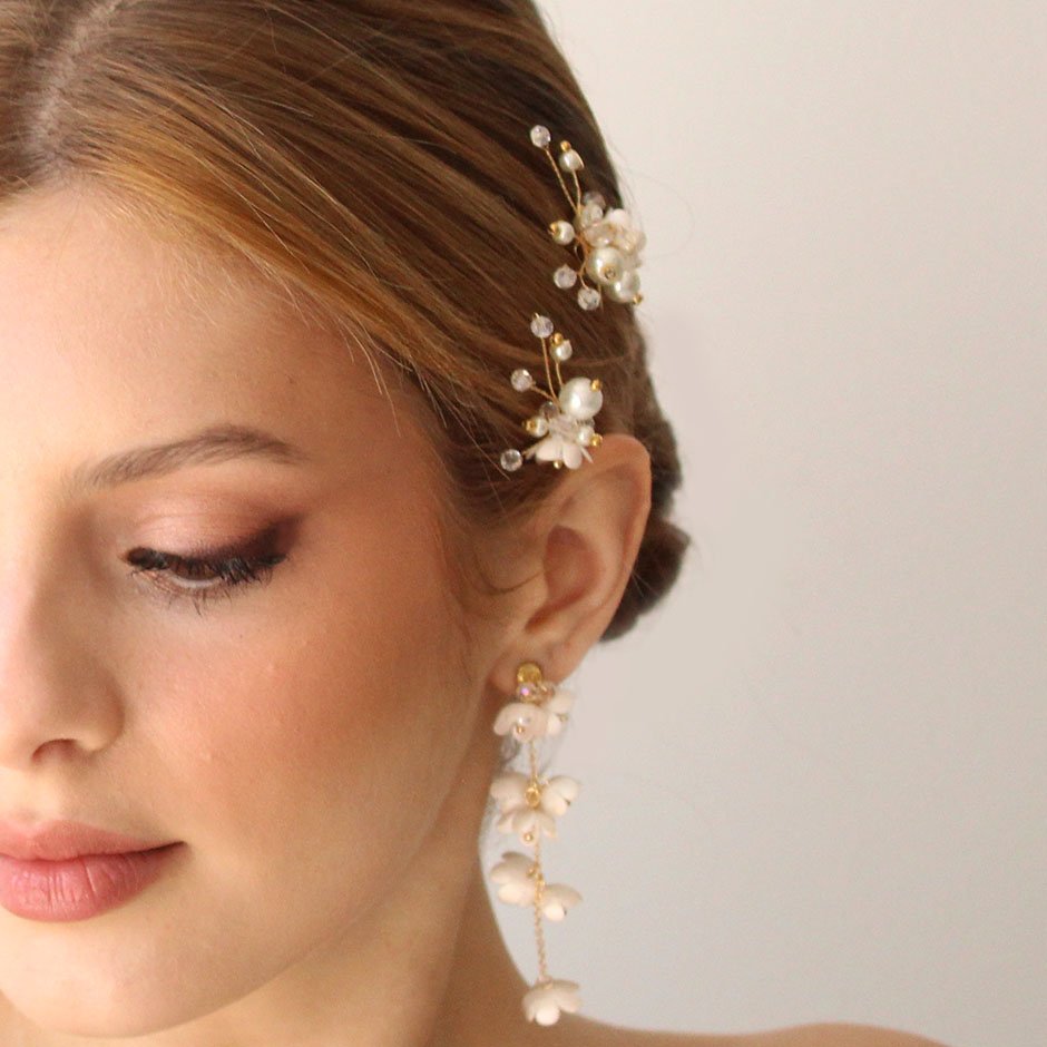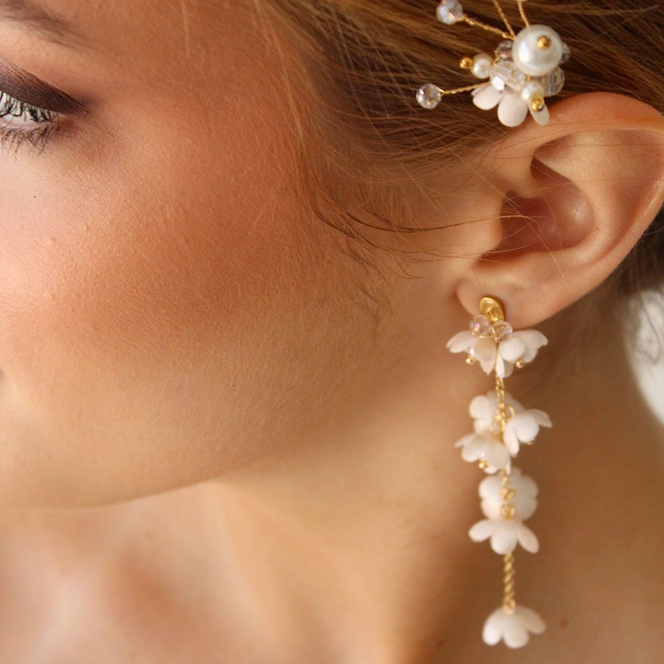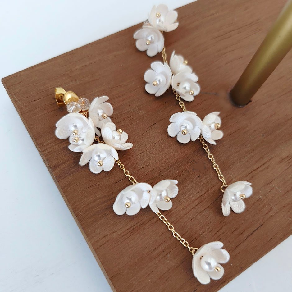 Brincos da linha noiva /cerimónia, em tons de branco e dourado. Com base e espigão em aço, bordada com cristais swarovsky facetados. Definidos por corrente banhada a ouro de 18kl, com flores em tecido e pérolas.