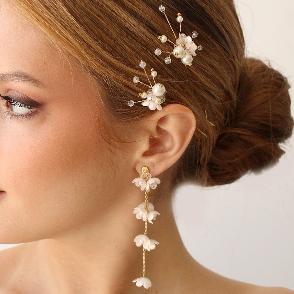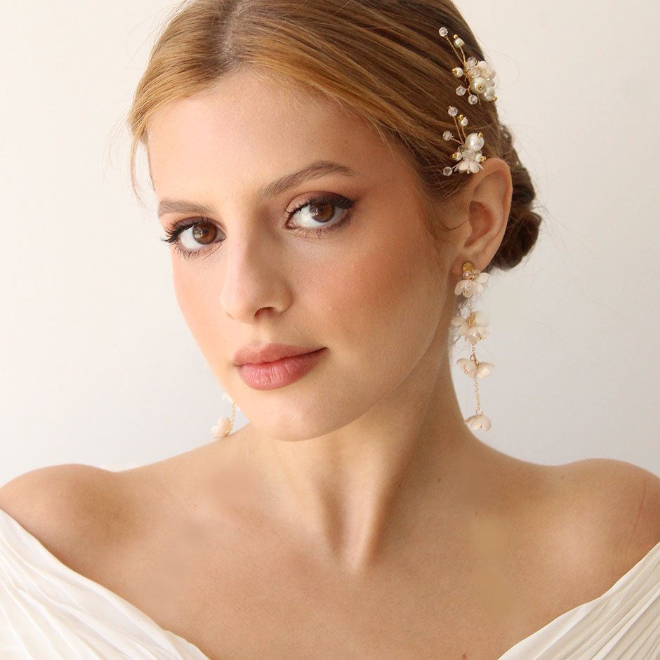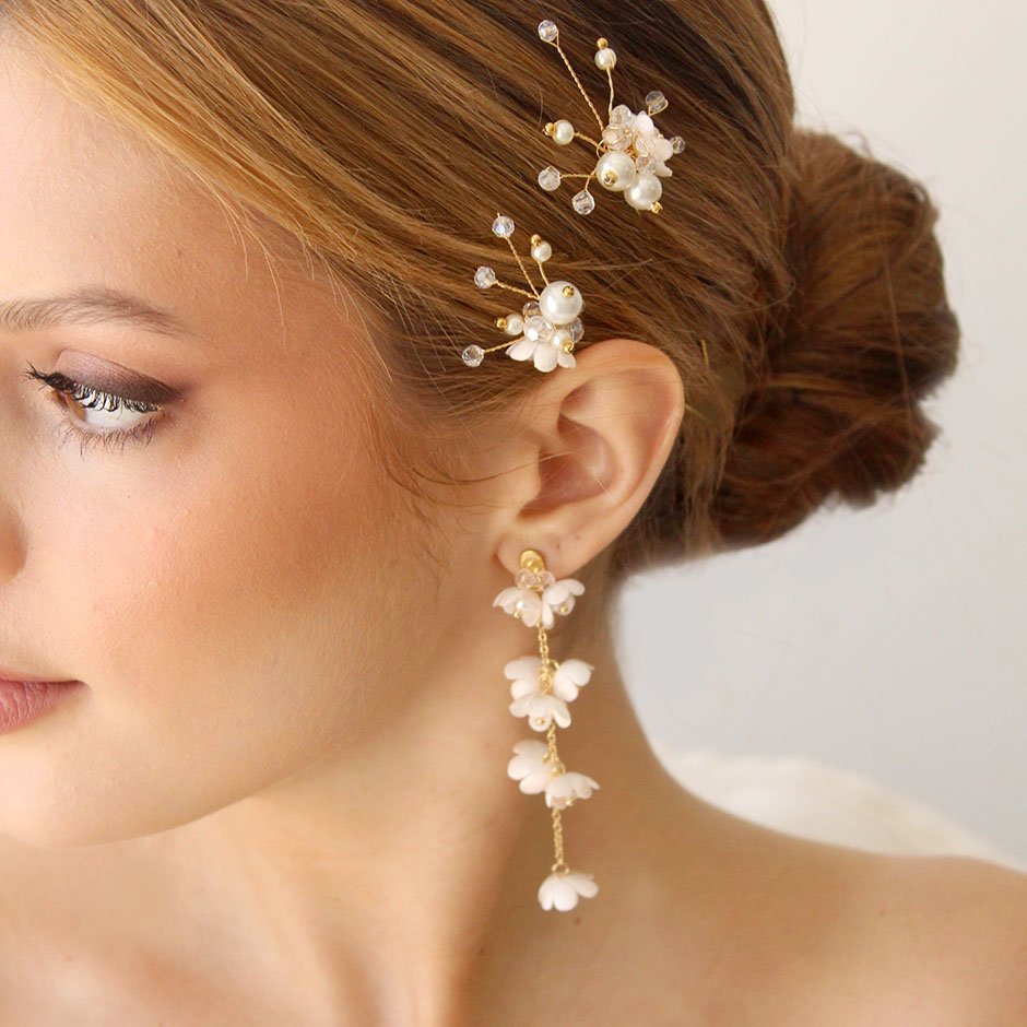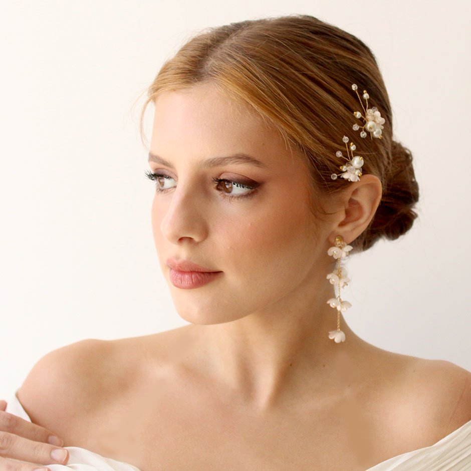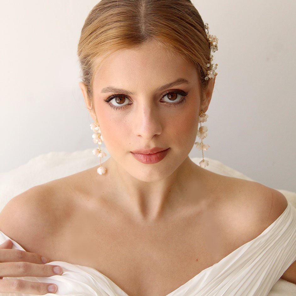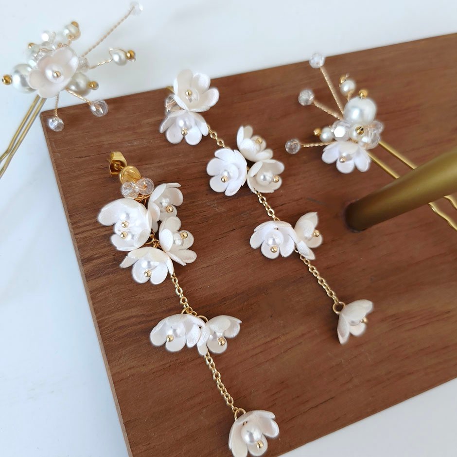 Brincos da linha noiva /cerimónia, em tons de branco e dourado. Com base e espigão em aço, bordada com cristais swarovsky facetados. Definidos por corrente banhada a ouro de 18kl, com flores em tecido e pérolas.