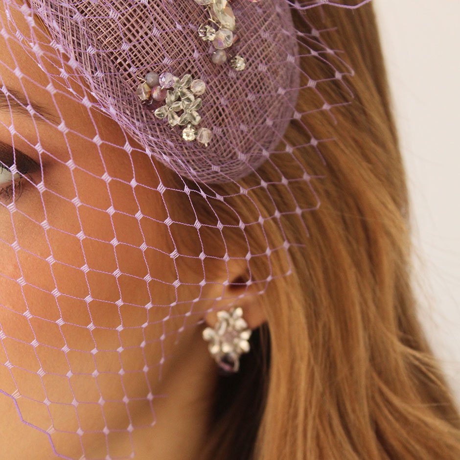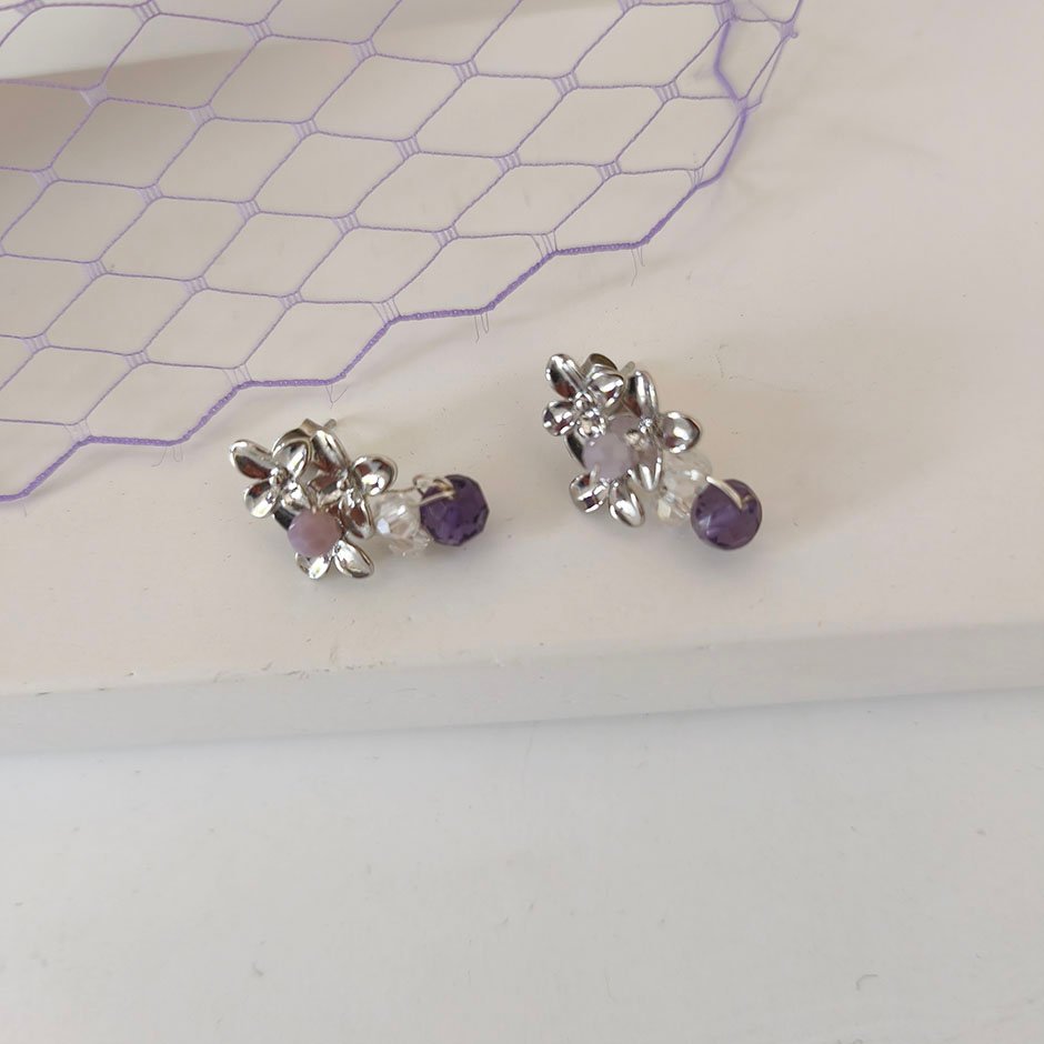 Brincos da linha casual/ cerimónia, em tons prateado e lilás. Com base e espigão em metal, banhado a ouro de 18kl. Bordados com cristais swarovsky facetados.