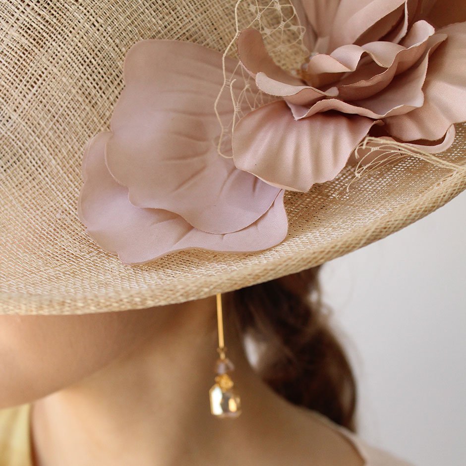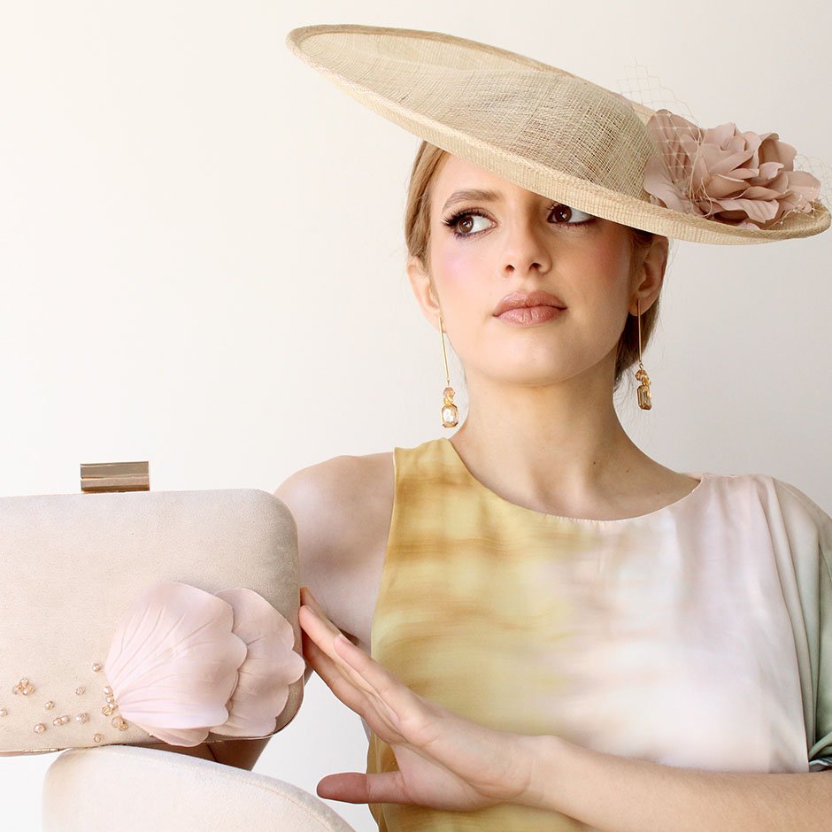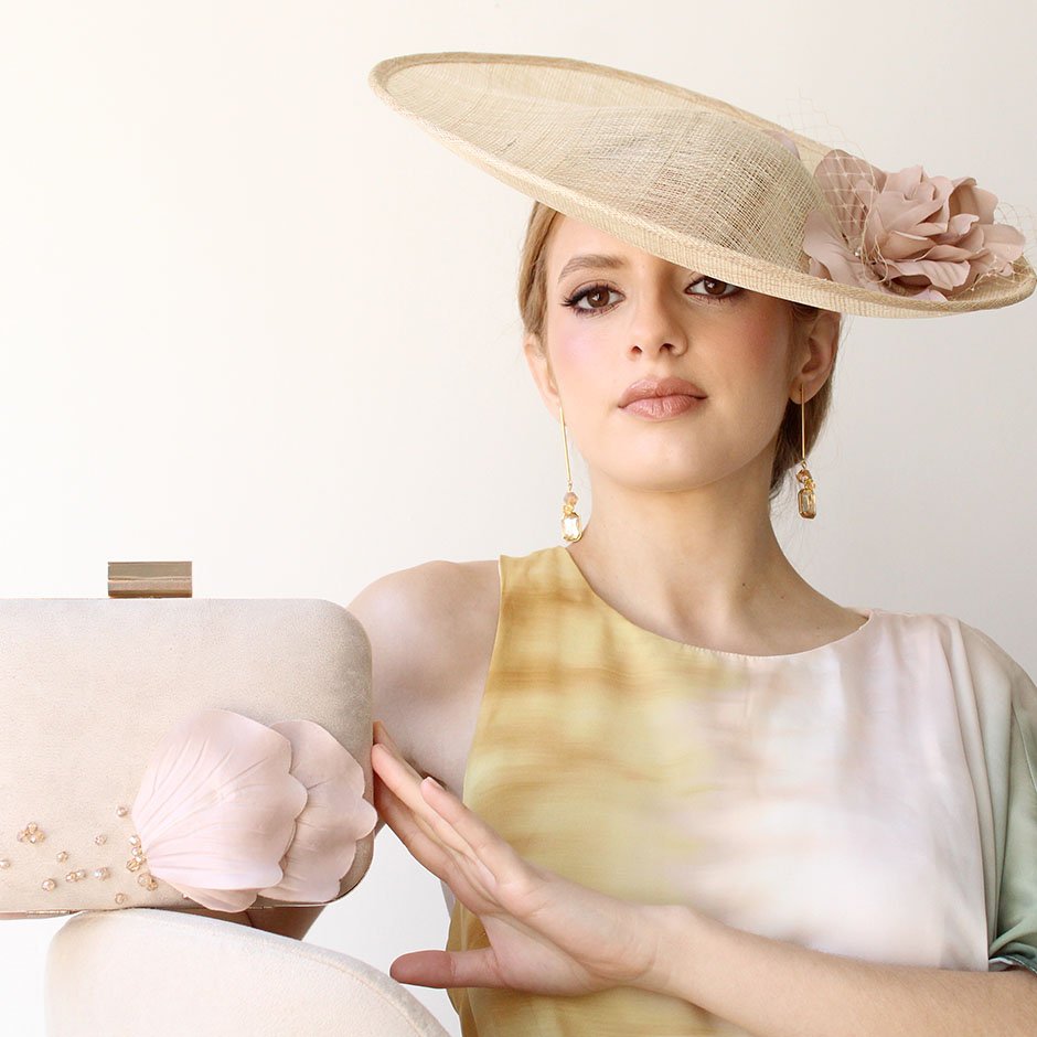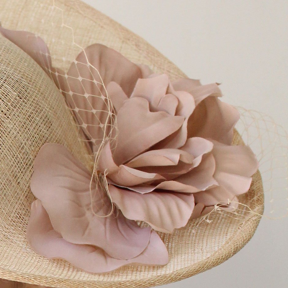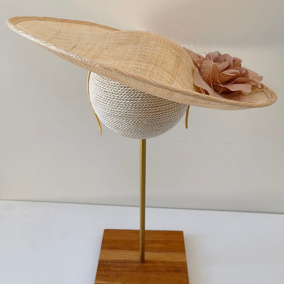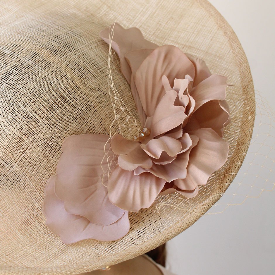 Chapéu da linha cerimónia em crú natural e nude . Com base irregular em sinaway, fixa em bandolete forrada a cetim, permite fixação fácil no cabelo e manutenção da posição inclinada que lhe confere uma elegância maior. Fácil colocação/remoção. Bordado com pétalas de flor em tecido acetinado tom nude, rede e apontamento de cristais swarovsky facetados.