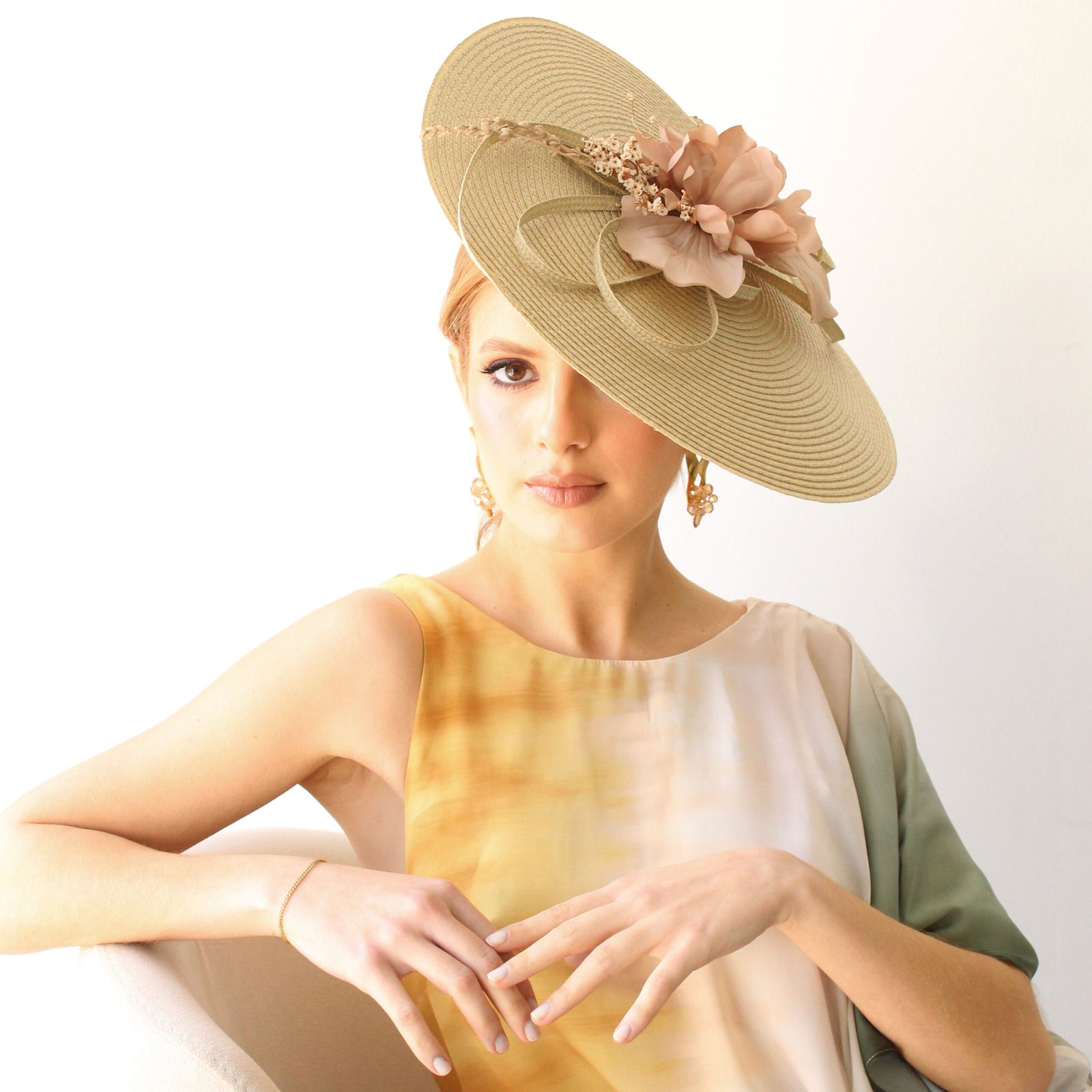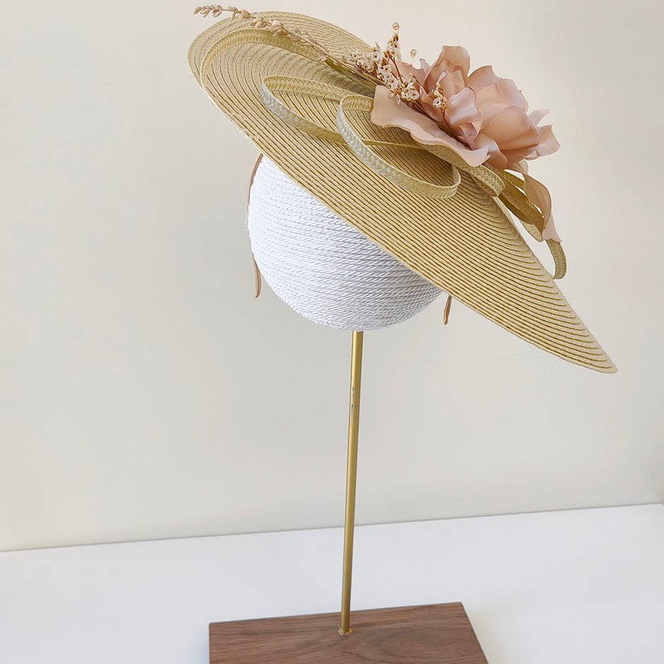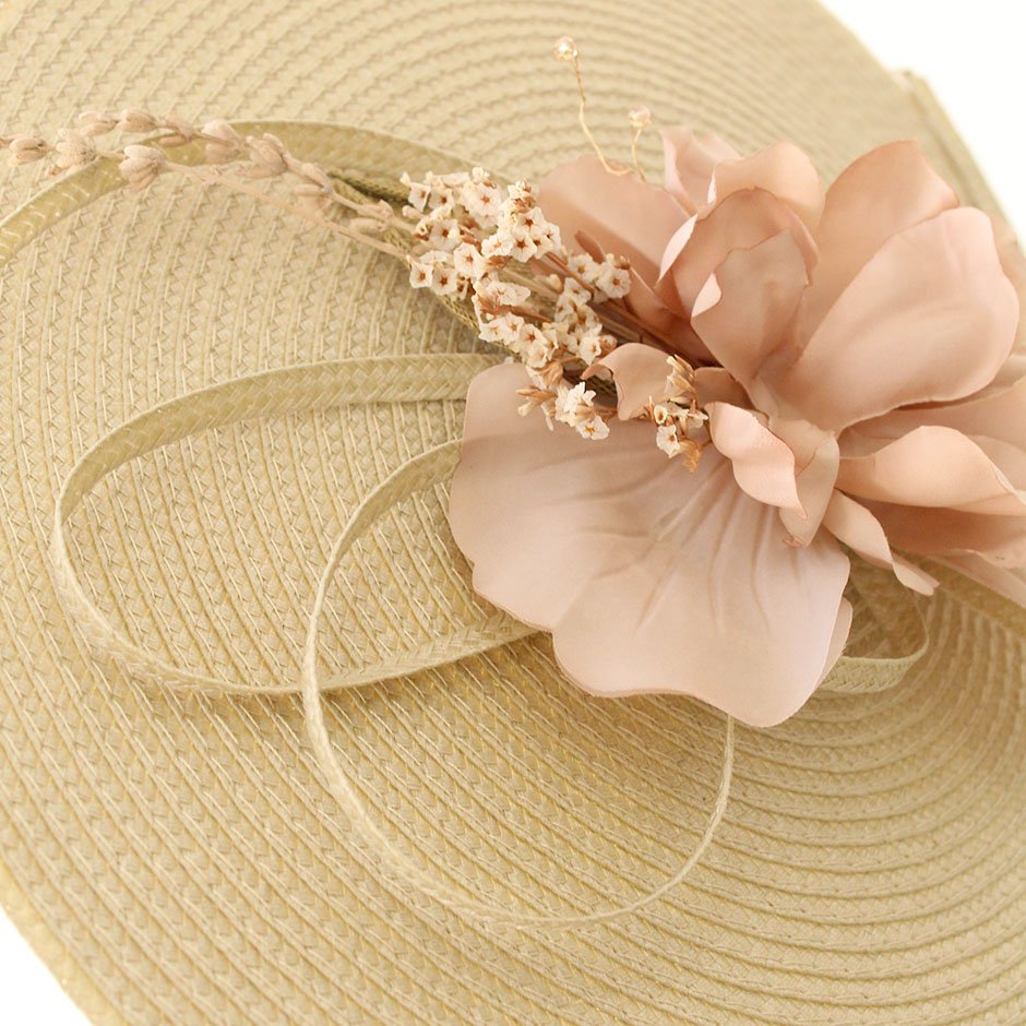 Chapéu da linha cerimónia em tons nude. Com base irregular em polipropileno, com definição de fita a partir da base, decorada ao centro com pétalas de flor nude, folha em sinaway, flores secas e lavanda preservada. Fixo em bandolete fina, facilmente disfarçada com o cabelo. Fixação em bandolete permite manter sempre a posição inclinada que lhe confere maior elegância. Confortável e de fácil colocação/remoção.