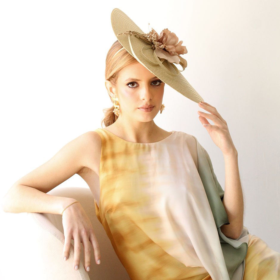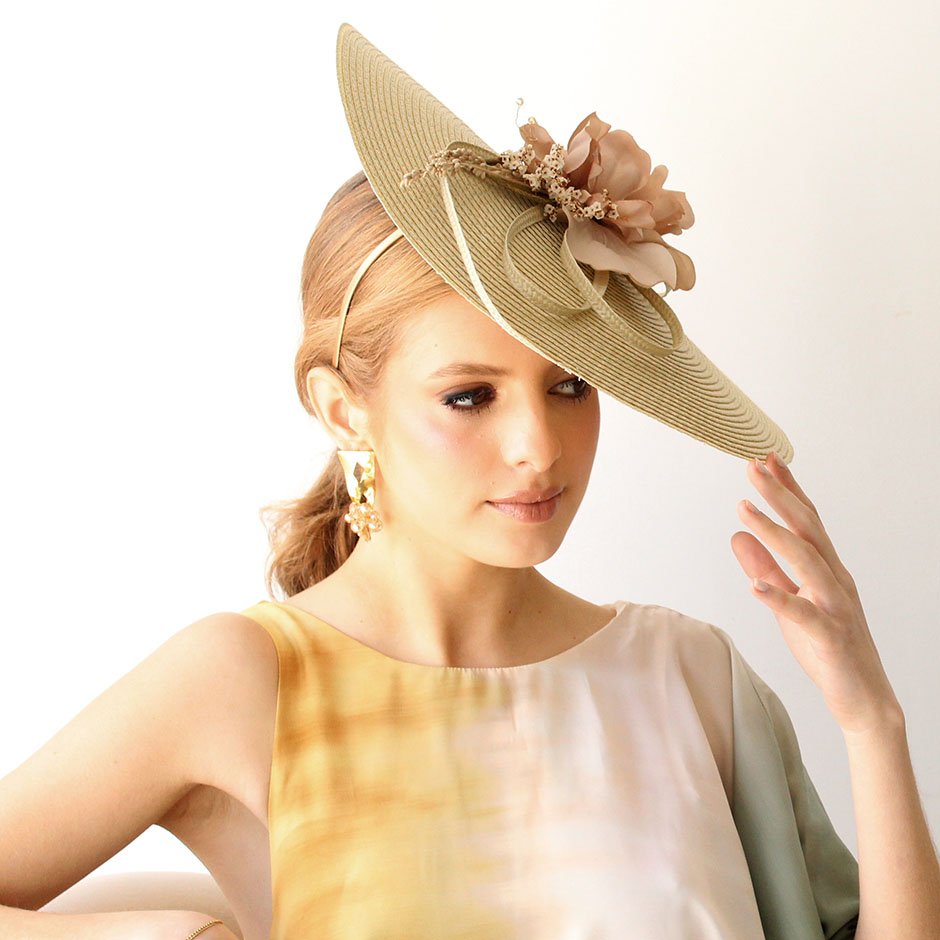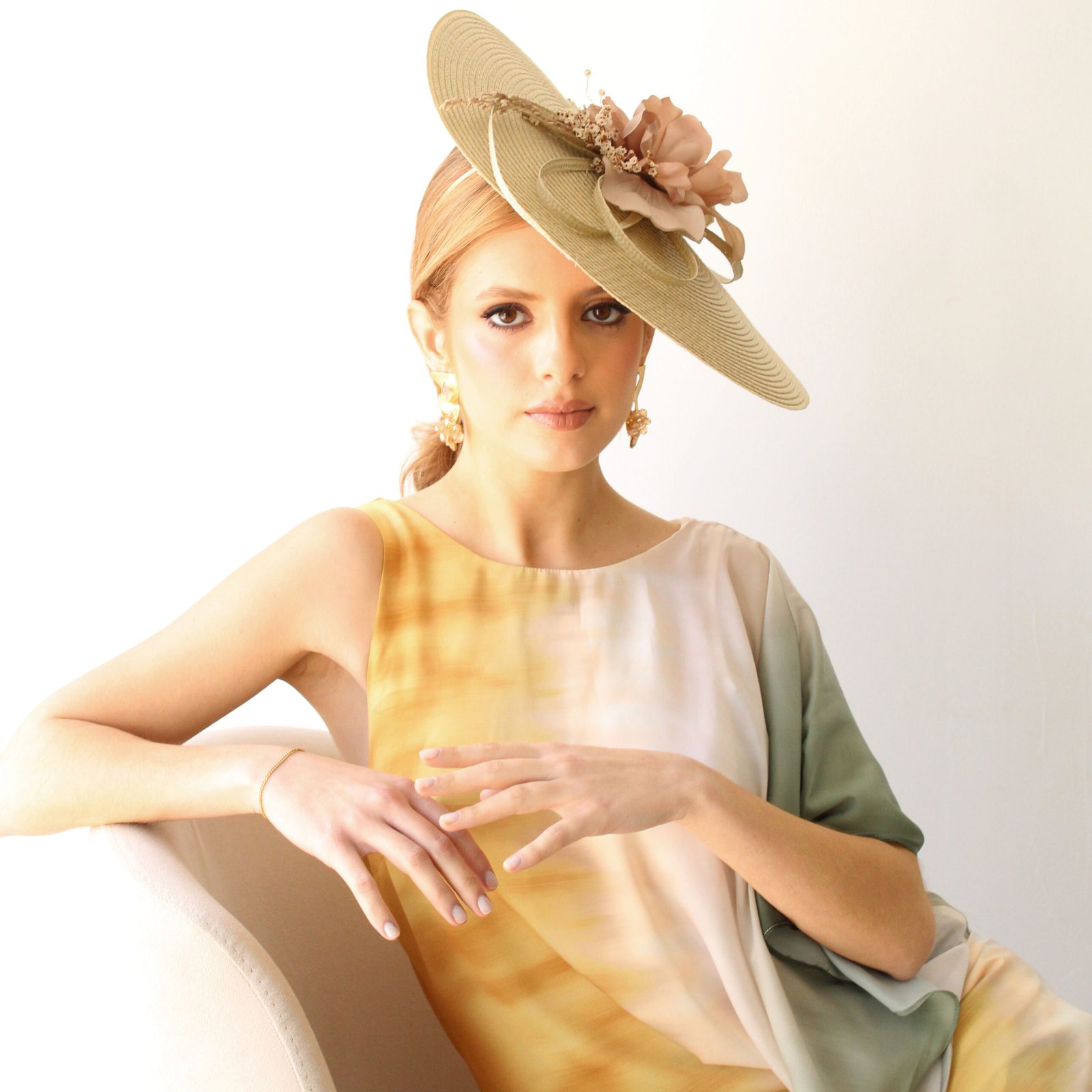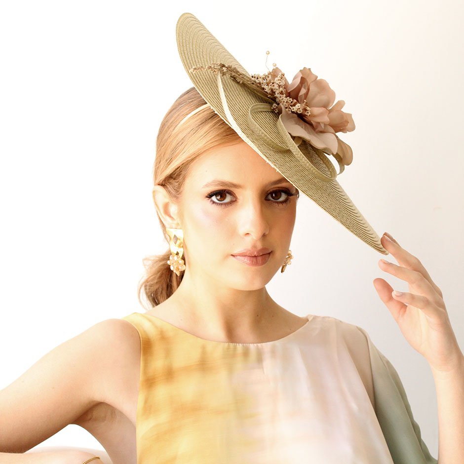 Chapéu da linha cerimónia em tons nude. Com base irregular em polipropileno, com definição de fita a partir da base, decorada ao centro com pétalas de flor nude, folha em sinaway, flores secas e lavanda preservada. Fixo em bandolete fina, facilmente disfarçada com o cabelo. Fixação em bandolete permite manter sempre a posição inclinada que lhe confere maior elegância. Confortável e de fácil colocação/remoção.