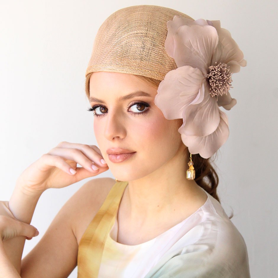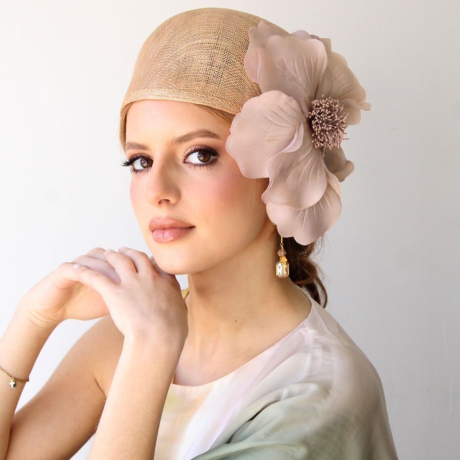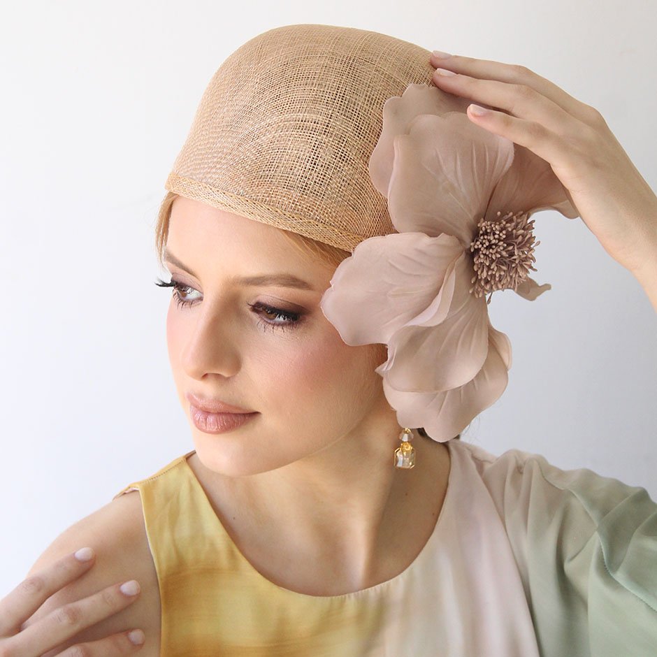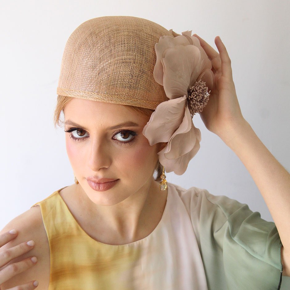 Chapéu sem aba, da linha cerimónia, em tons nude. Definido por copa redonda em sinaway, bordado lateralmente com flor amovível. Esta flor de pétalas em tecido e centro em pristilos, está fixa em base metálica dupla, com pinça e alfinete. Está integrada no toucado mas pode ser usado num outro local se assim entender. Este elemento confere uma enorme versatilidade a este toucado.