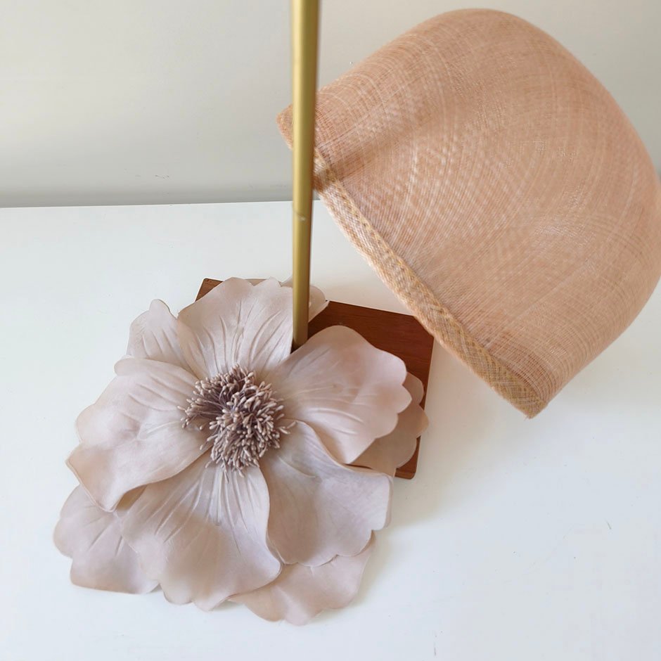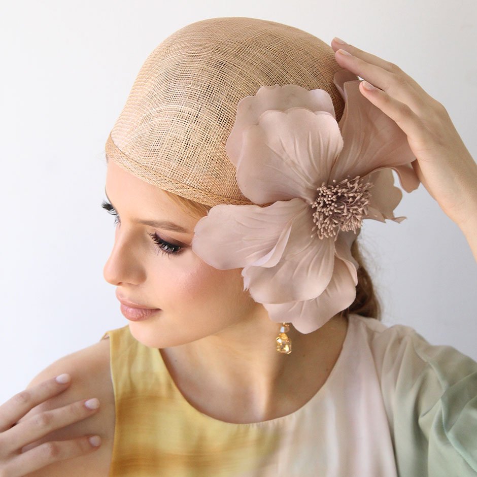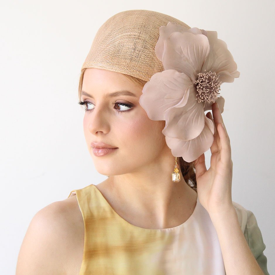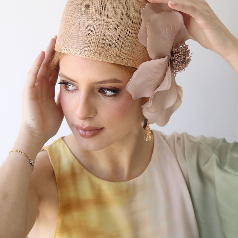 Chapéu sem aba, da linha cerimónia, em tons nude. Definido por copa redonda em sinaway, bordado lateralmente com flor amovível. Esta flor de pétalas em tecido e centro em pristilos, está fixa em base metálica dupla, com pinça e alfinete. Está integrada no toucado mas pode ser usado num outro local se assim entender. Este elemento confere uma enorme versatilidade a este toucado.
