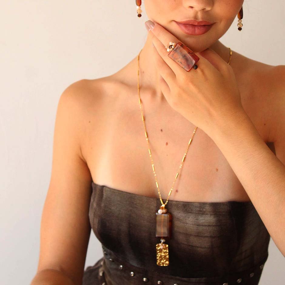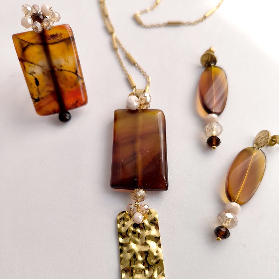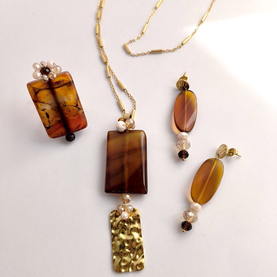 Colar da linha casual , em tons de dourado e castanho. Corrente, mosquetão e corrente de ajuste em aço, com medalhão definido por pedra natural rectangular, cristais swarovsky facetados e rematado com rectangulo em aço efeito martelado.