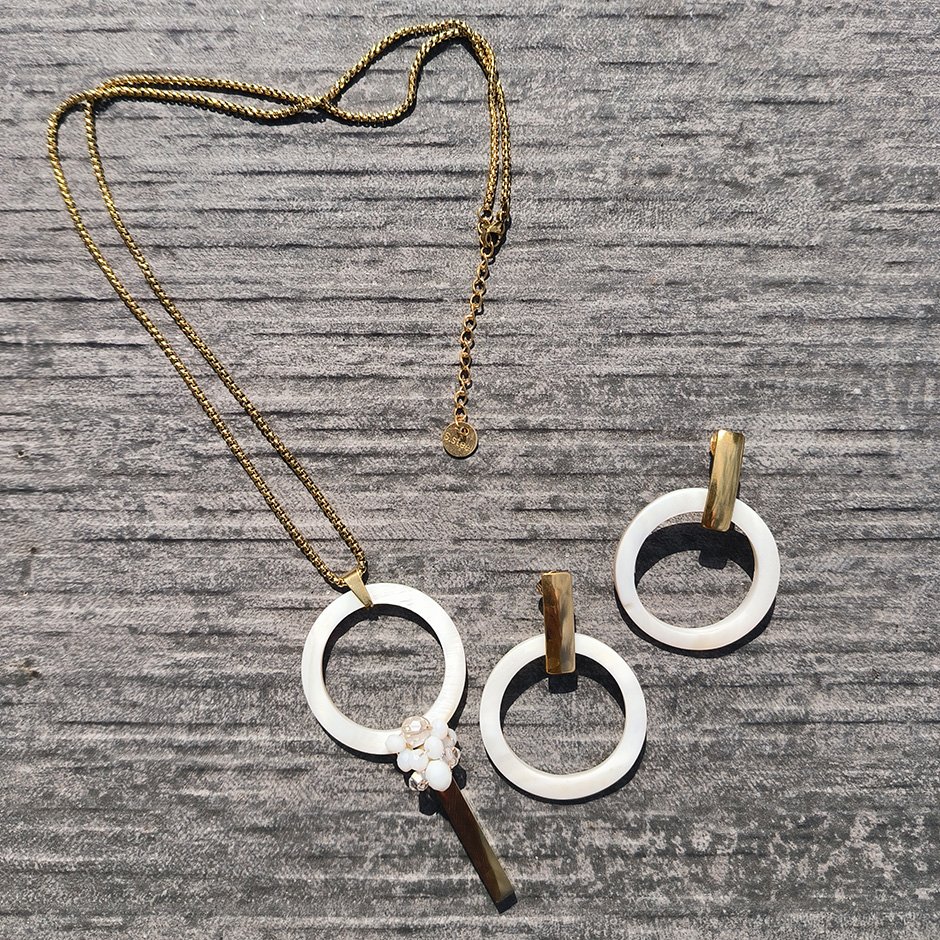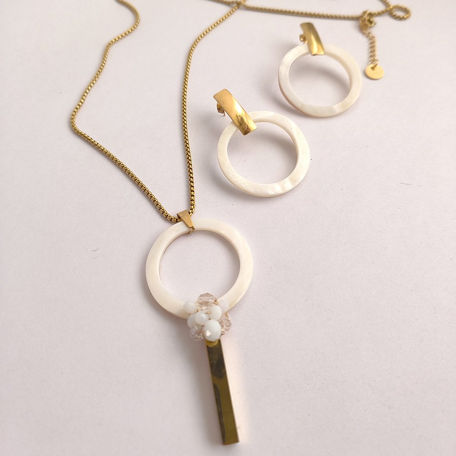 Colar da linha casual, em tons dourado e branco. Com corrente em malha, mosquetão e corrente de ajuste totalmente em aço, circulo em madre pérola branco, bordado ao centro com cristais swarovsky facetados.