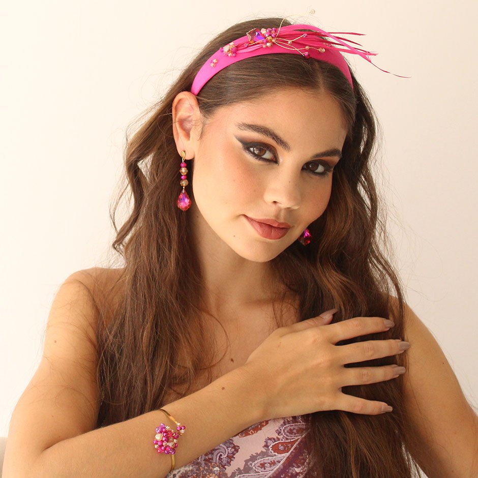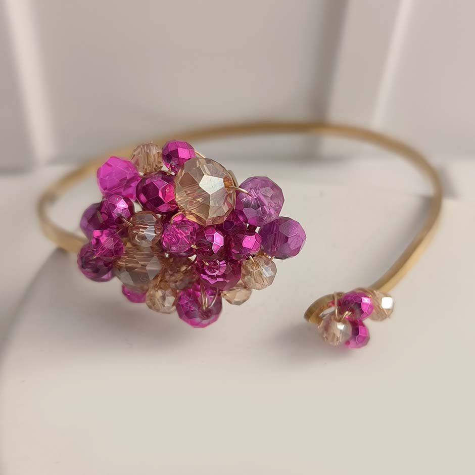 Pulseira da linha cerimónia, em tons dourado, nude e rosa fushia. Com base em aço, ajustável, em efeito escrava, bordada ao centro com cristais swarovsky facetados.