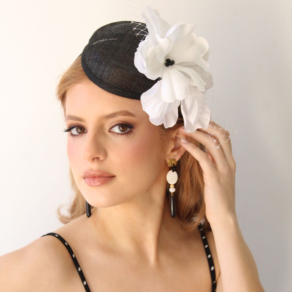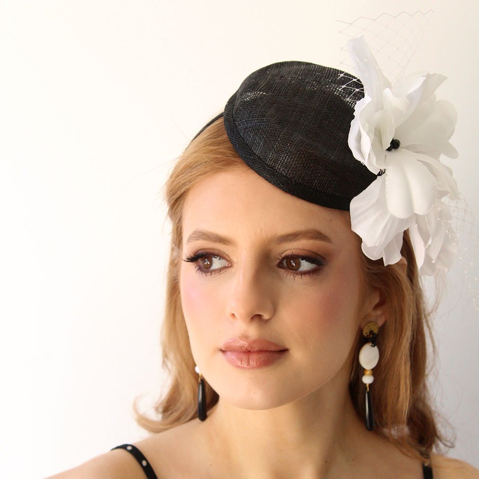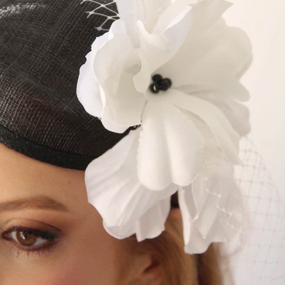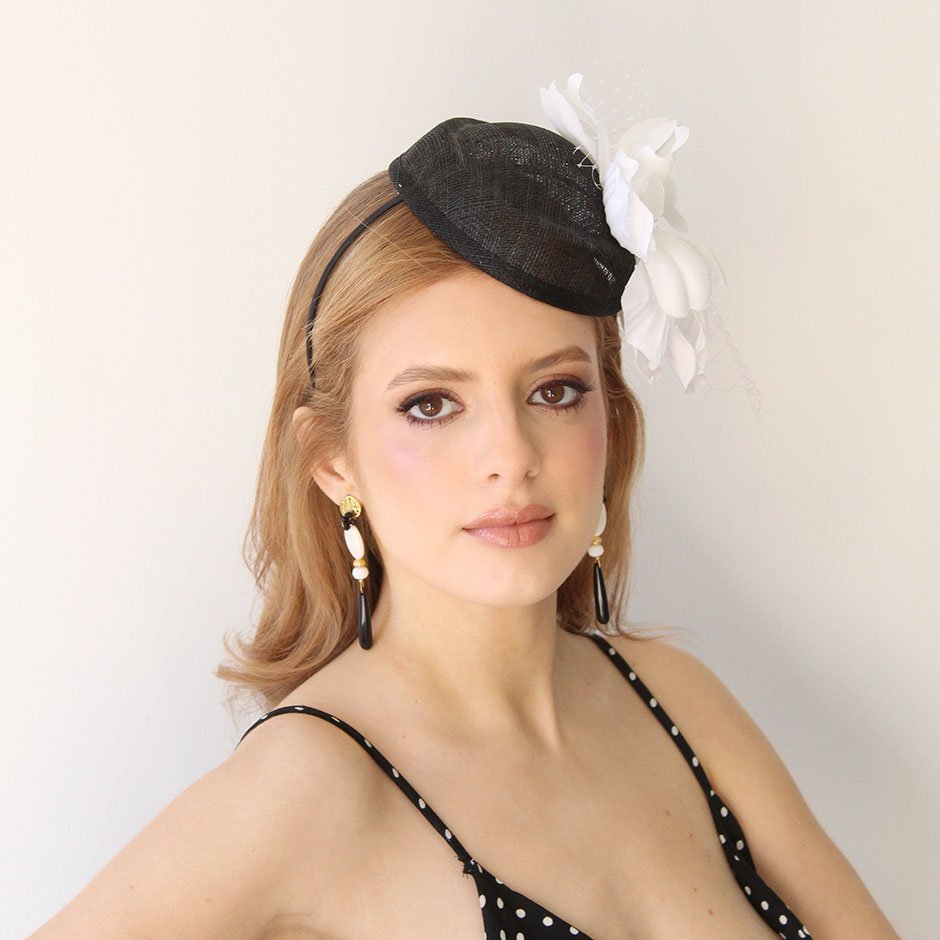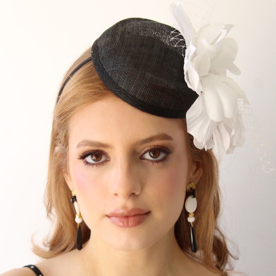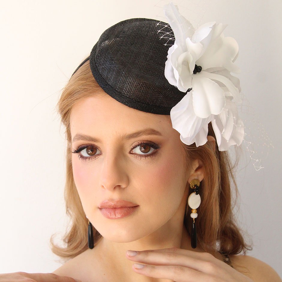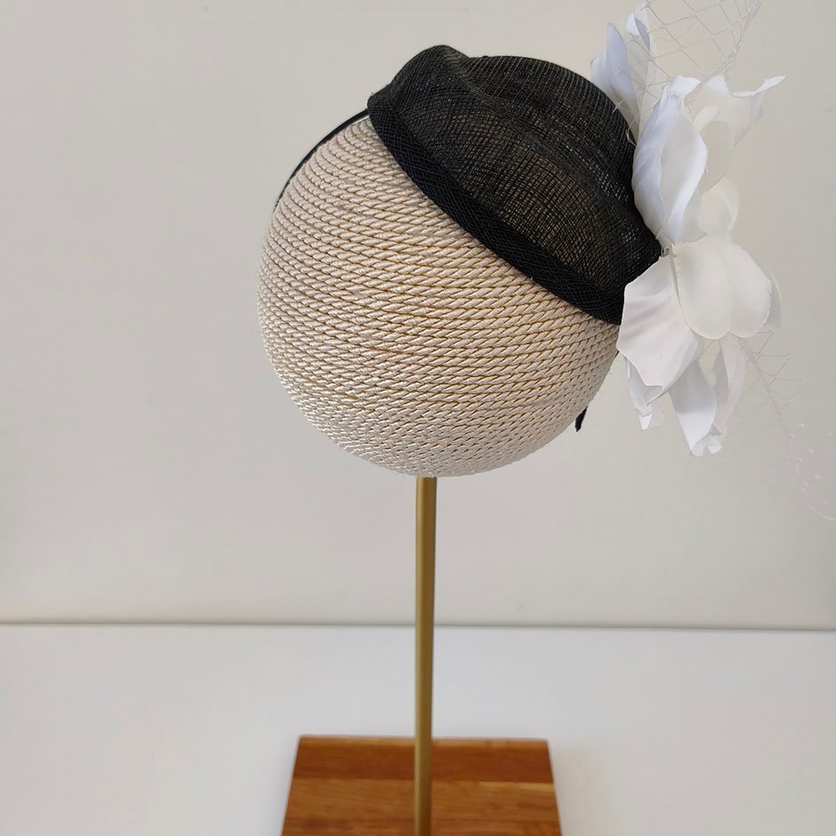 Toucado da linha cerimónia em tons preto e branco. Toucado de copa , em sinaway, fixo em bandolete fina, facilmente disfarçada pelo cabelo. Com pétalas de flor acetinada lateralmente, rede e cristais swarovsky facetados.
